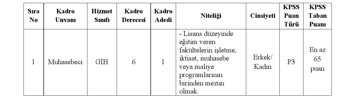 Rize ili Kalkandere Belediye Başkanlığı bünyesinde, 657 sayılı Devlet Memurları Kanununa tabi olarak istihdam edilmek üzere; Mahalli İdarelere İlk Defa Atanacaklara Dair Sınav ve Atama Yönetmeliği hükümlerine göre aşağıda unvanı, sınıfı, derecesi, adedi, nitelikleri, KPSS puan türü, KPSS taban puanı ve diğer şartları taşımak kaydıyla belirtilen boş kadrolara açıktan atama yoluyla memur alınacaktır.