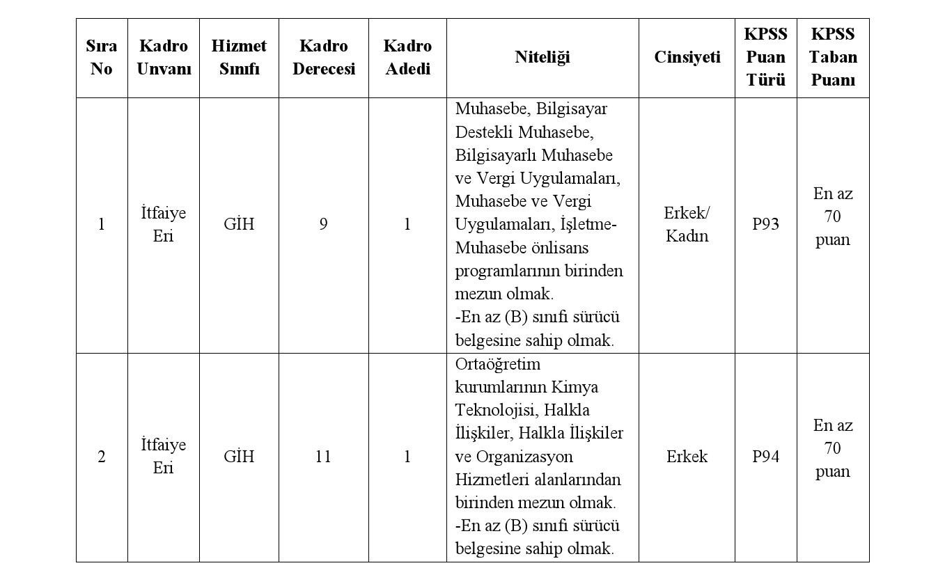 Bolu ili Gerede Belediye Başkanlığı bünyesinde, 657 sayılı Devlet Memurları Kanununa tabi olarak istihdam edilmek üzere; Belediye İtfaiye Yönetmeliği hükümlerine göre aşağıda unvanı, sınıfı, derecesi, adedi, nitelikleri, KPSS puan türü, KPSS taban puanı ve diğer şartları taşımak kaydıyla belirtilen boş kadrolara açıktan atama yoluyla itfaiye eri alımı yapılacaktır.