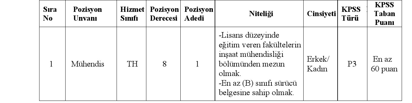 Trabzon ili Vakfıkebir Belediye Başkanlığı bünyesinde Belediye Başkanlığı bünyesinde 5393 sayılı Belediye Kanununun 49 uncu maddesi ile Mahalli İdarelere İlk Defa Atanacaklara Dair Sınav ve Atama Yönetmeliği hükümlerine göre aşağıda unvanı, sınıfı, derecesi, adedi, nitelikleri, KPSS puan türü, KPSS taban puanı ve diğer şartları taşımak kaydıyla, belirtilen boş pozisyona tam zamanlı sözleşmeli personel alınacaktır.