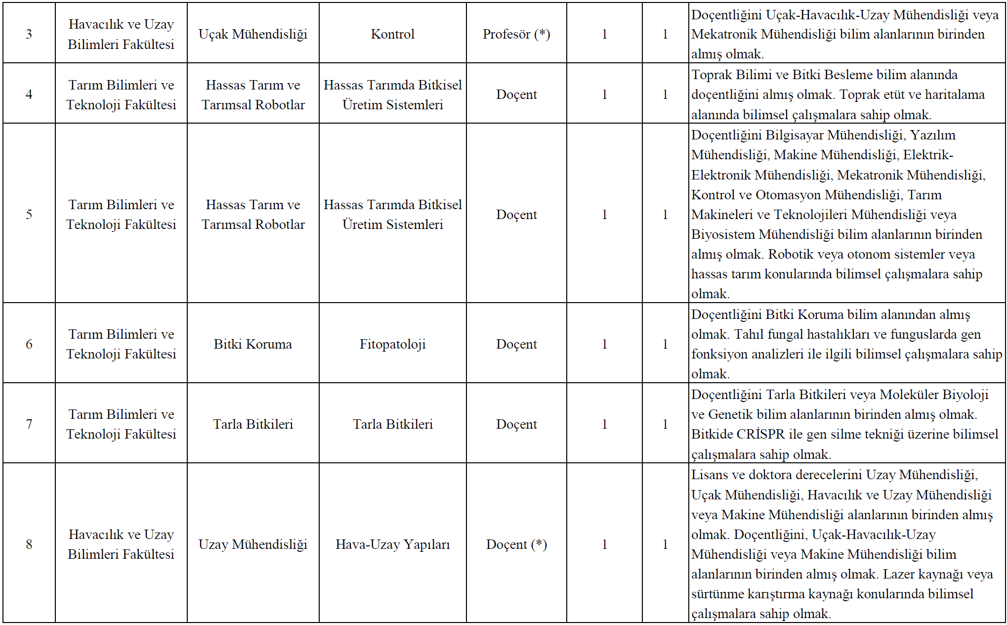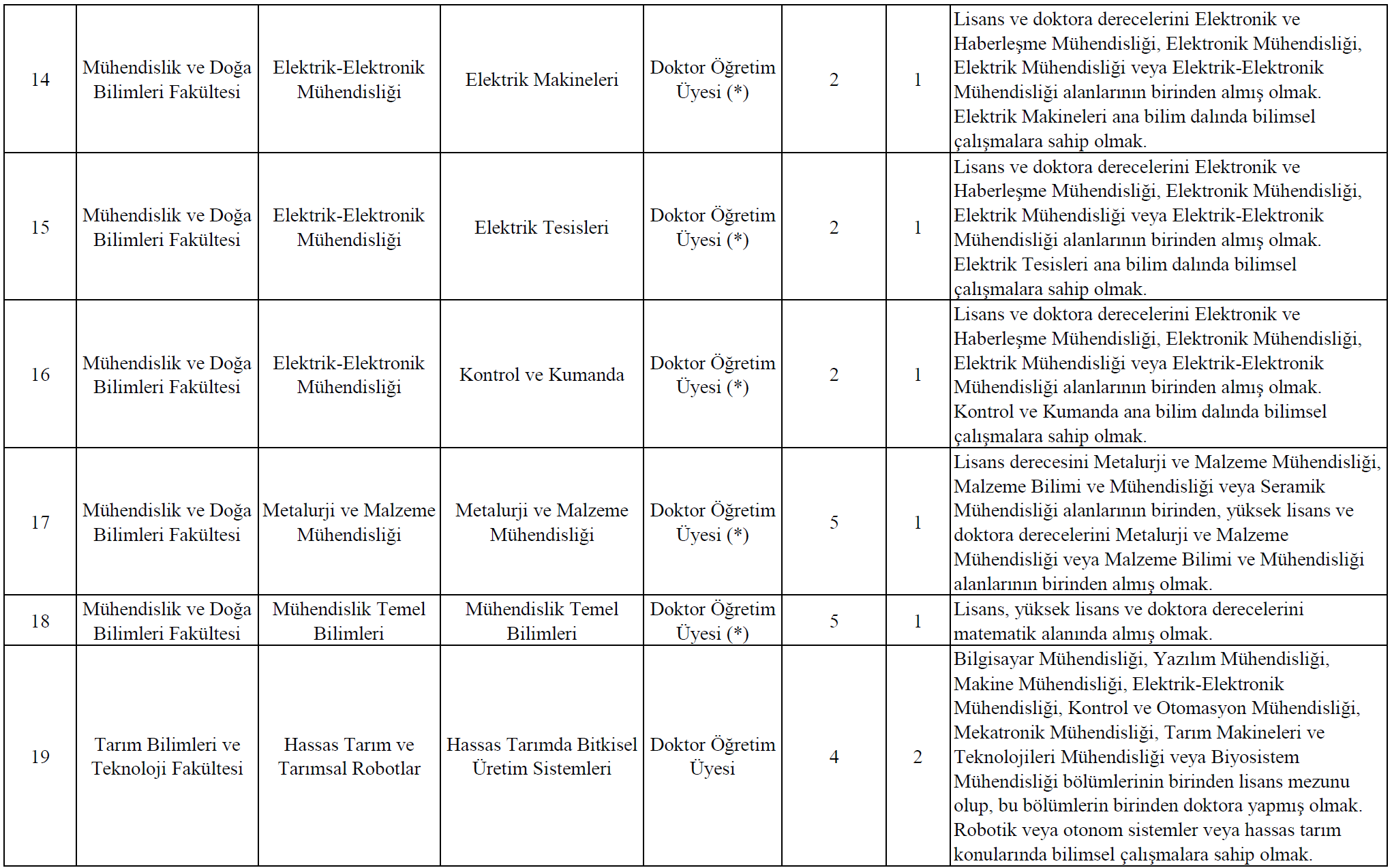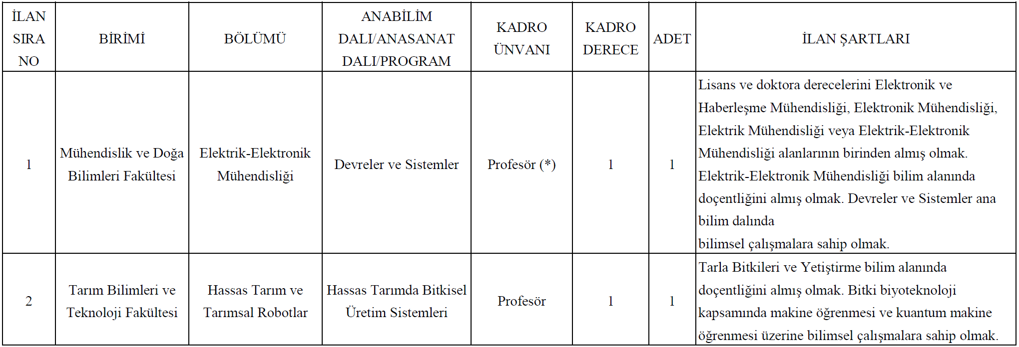 1- Üniversitemiz akademik birimlerine, 2547 sayılı Kanun ve 12/06/2018 tarihli Resmi Gazete'de yayımlanan Öğretim Üyeliğine Yükseltilme ve Atanma Yönetmeliği'nin ilgili maddeleri ile Üniversitemizin Öğretim Üyeliğine Yükseltilme ve Atanma Yönergesi esasları uyarınca, 657 Sayılı Devlet Memurları Kanunu'nun 48. Maddesinde belirtilen şartları sağlamış olmak koşuluyla, aşağıda bölüm ve anabilim dalı itibariyle unvanları belirtilen öğretim üyeleri alınacaktır.