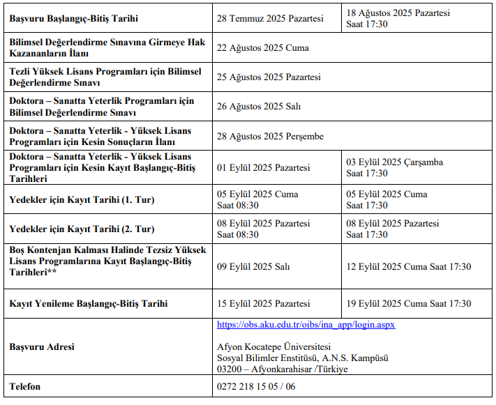 2025-2026 Eğitim Öğretim yılı güz döneminde, Afyon Kocatepe Üniversitesi Sosyal Bilimler Enstitüsü'ne bağlı Anabilim/Anasanat dalları programlarına lisansüstü eğitim için öğrenci alımına yönelik; takvim, başvuru koşulları, başvuru şekli, program kontenjanları ve açıklamaları (şartları) ile ilgili detaylı bilgiler aşağıda sunulmuştur.