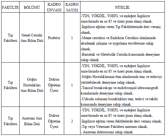 Üniversitemizin aşağıda belirtilen birimlerinde açık bulunan Profesör, Doktor Öğretim Üyesi kadrolarına 2547 sayılı Yükseköğretim Kanununun 26. ve 23.maddesi ile Öğretim Üyeliğine Yükseltilme ve Atanma Yönetmeliğinin ilgili maddeleri hükümlerine göre tam zamanlı statüde Öğretim Üyeleri alınacaktır.