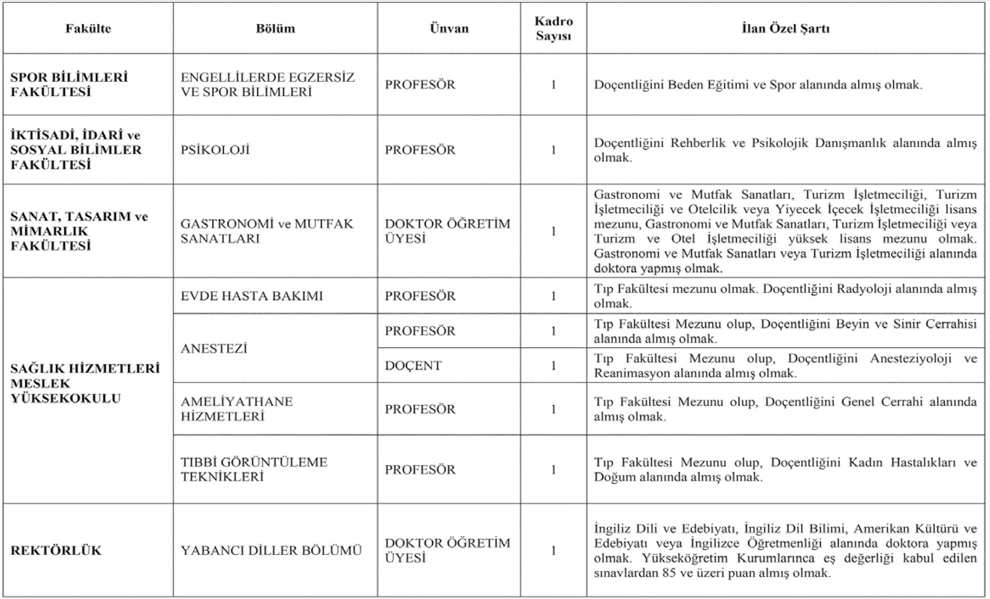 Üniversitemizin aşağıda belirtilen Fakülte ve Yüksekokul Bölümlerine 2547 Sayılı Yükseköğretim Kanunu "öğretim Üyeliğine Yükseltilme ve Atanma Yönetmeliği"nin ilgili maddelerine göre Öğretim Üyeleri alınacaktır.