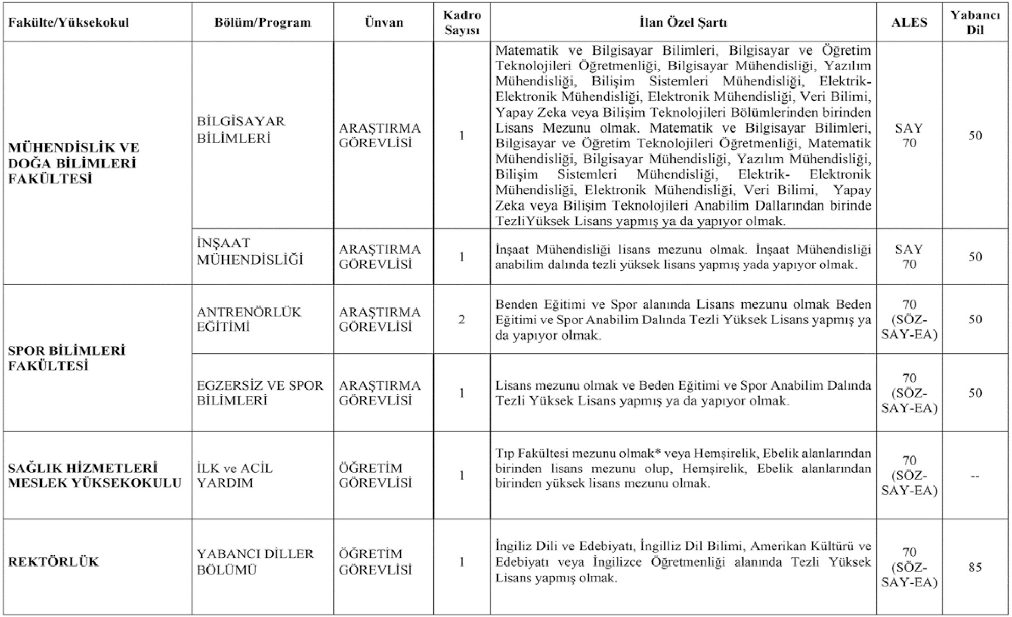 Üniversitemizin aşağıda belirtilen Fakülte Bölümleri için 2547 Sayılı Yükseköğretim Kanunu ve "Öğretim Üyesi Dışındaki Öğretim Elemanı Kadrolarına Yapılacak Atamalarda Uygulanacak Merkezi Sınav ile Giriş Sınavlarına İlişkin Usul ve Esaslar Hakkında Yönetmelik" ilgili maddelerine göre öğretim Elemanı kadrolarına Personel alımı yapılacaktır.