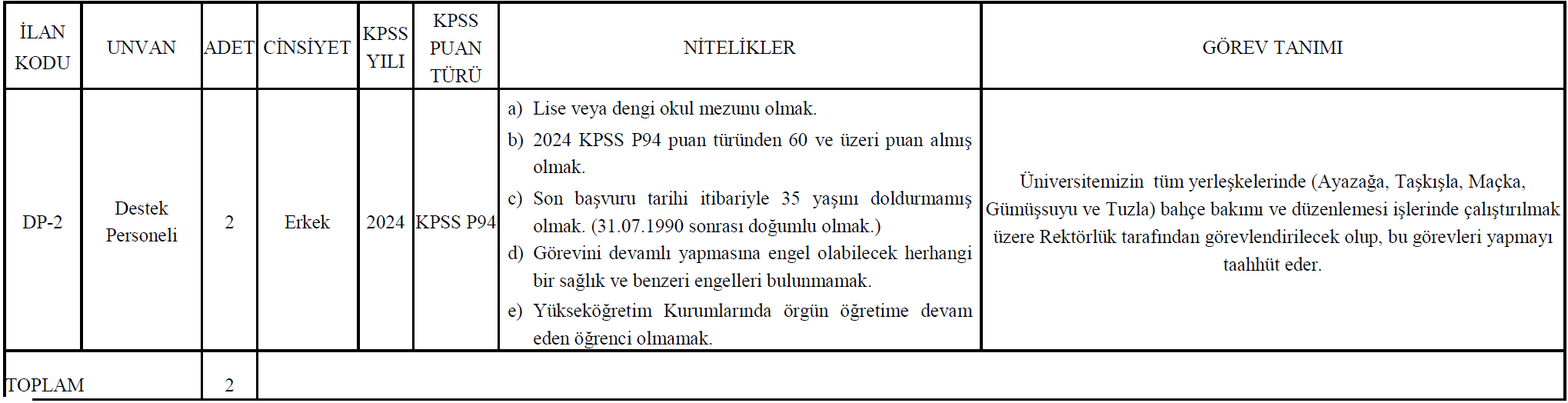 657 sayılı Devlet Memurları Kanunu'nun 4 üncü maddesinin (B) fıkrası ile 06.06.1978 tarih ve 7/15754 sayılı Bakanlar Kurulu Kararı ile yürürlüğe konulan Sözleşmeli Personel Çalıştırılmasına İlişkin Esaslar'ın Ek 2 nci maddesinin (c) bendi çerçevesinde; Üniversitemiz birimlerinde 2024 KPSS (B) grubundan istihdam edilmek üzere aşağıdaki tabloda belirtilen pozisyona ilan şartlarına uyan kişiler arasından KPSS puan sırasına göre toplam 2 adet sözleşmeli personel alınacaktır.
