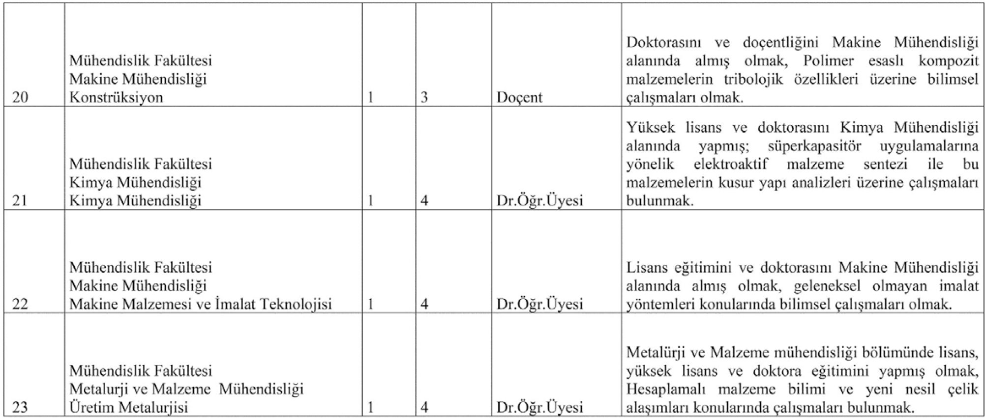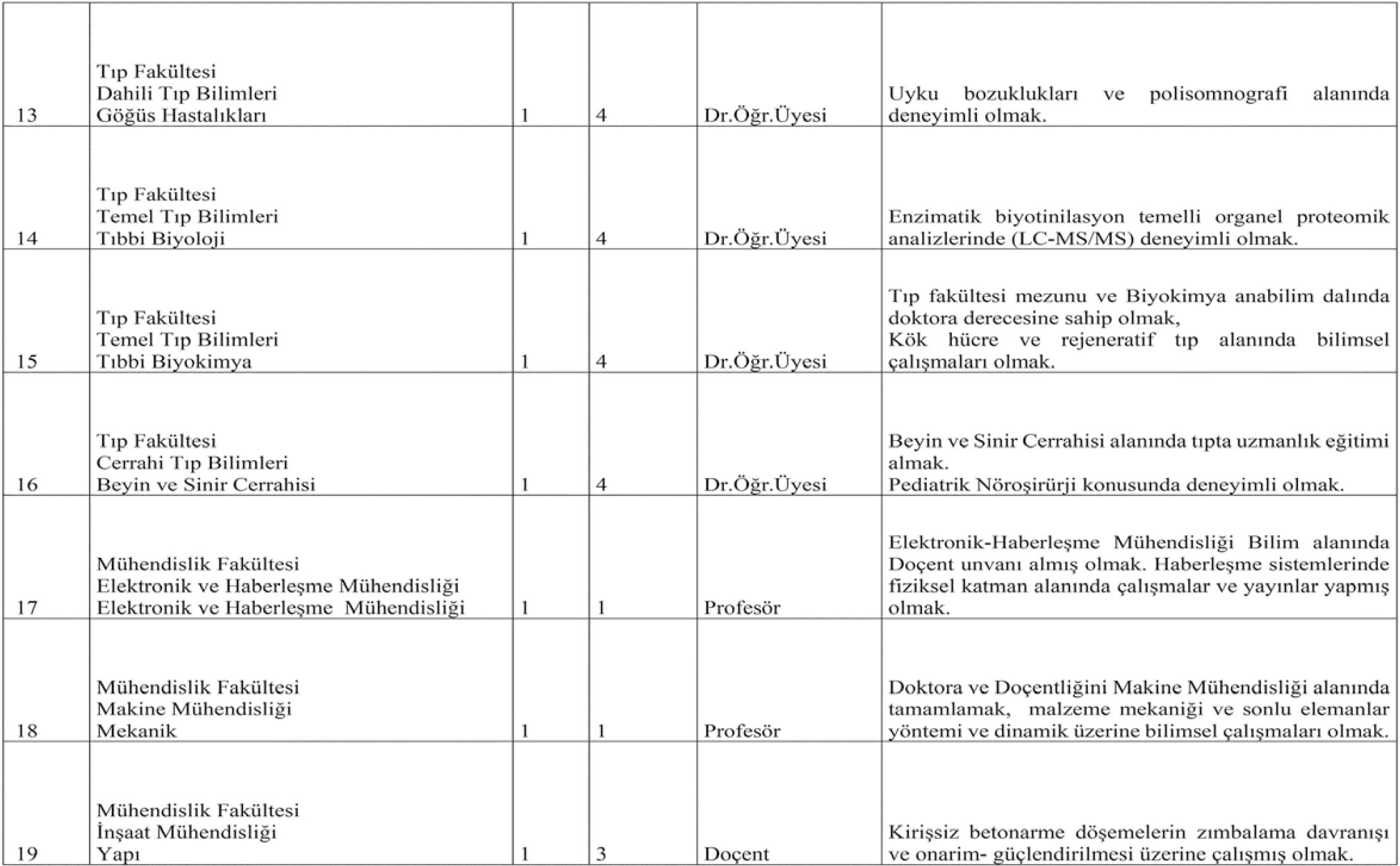 Üniversitemizin aşağıda belirtilen birimlerine 2547 sayılı Kanun'un ilgili maddeleri ile 12.06.2018 tarih ve 30449 saydı Resmi Gazete'de yayınlanan "öğretim Üyeliğine Yükseltilme ve Atama Yönetmeliği"nin ilgili maddeleri ve 657 sayılı Devlet Memurları Kanununun 48. Maddesi uyarınca Üniversitemiz internet sayfasında yayımlanan "Akademik Personel Atama Yönergesi"nin öngörülen koşullarını sağlamış olmak şartıyla öğretim üyesi alınacaktır.