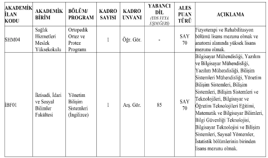 Üniversitemizin aşağıda belirtilen akademik birimlerine, 2547 sayılı Yükseköğretim Kanunu ve Öğretim Üyesi Dışındaki Öğretim Elemanı Kadrolarına Yapılacak Atamalarda Uygulanacak Merkezi Sınav ile Giriş Sınavlarına İlişkin Usul ve Esaslar Hakkında Yönetmeliğin ilgili maddelerine göre öğretim elemanları alınacaktır.