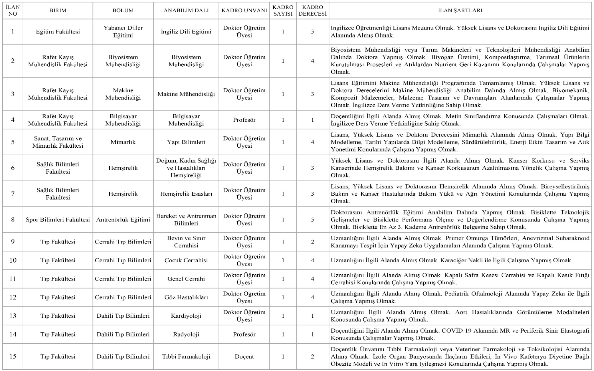 Üniversitemizin aşağıda belirtilen birimlerine, 2547 sayılı Yükseköğretim Kanunu, 2914 sayılı Yükseköğretim Personel Kanunu, Öğretim Üyeliğine Yükseltilme ve Atanma Yönetmeliği, Üniversitemiz Akademik Yükseltme ve Atama Kriterlerinin ilgili hükümleri ile 657 sayılı Devlet Memurları Kanununun 48. maddesi hükümleri uyarınca öğretim üyesi alınacaktır. Başvuru süresi ilanın Resmi Gazete'de yayımlandığı tarihten itibaren 15 (on beş) günd ür.