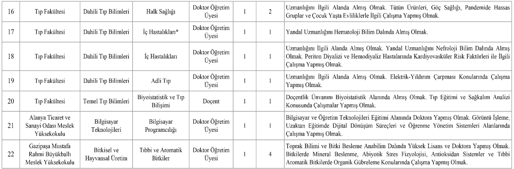 *Tıp Fakültesi İç Hastalıkları Anabilim Dalı (Han No: 17) "Doktor Öğretim Üyesi" kadrosu, öğretim üyesi temininde güçlük çekilmesi nedeniyle Üniversitemiz Yönetim Kurulu Kararı gereği Alanya Alaaddin Keykubat Üniversitesi Akademik Yükseltme ve Atama Kriterleri 'nden muaf tutulacaktır.