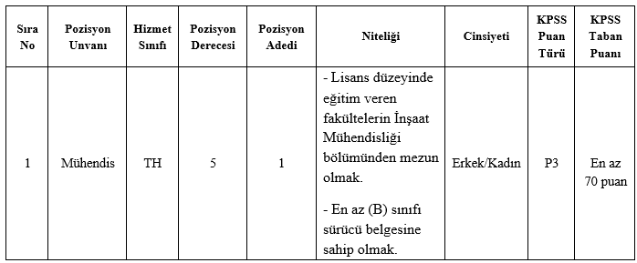 Konya ili Hüyük Belediye Başkanlığı bünyesinde 5393 sayılı Belediye Kanununun 49 uncu maddesi ile Mahalli İdarelere İlk Defa Atanacaklara Dair Sınav ve Atama Yönetmeliği hükümlerine göre aşağıda unvanı, sınıfı, derecesi, adedi, nitelikleri, KPSS puan türü, KPSS taban puanı ve diğer şartları taşımak kaydıyla, belirtilen boş pozisyona tam zamanlı sözleşmeli personel alınacaktır.