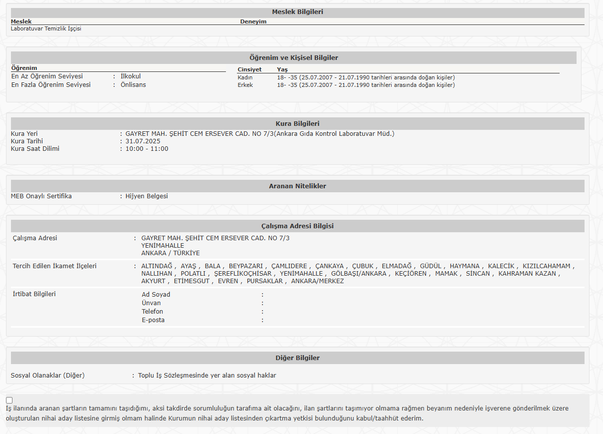 Ankara Gıda Kontrol Müd. 3 İşçi alacak. Son başvuru tarihi 25 Temmuz 2025.