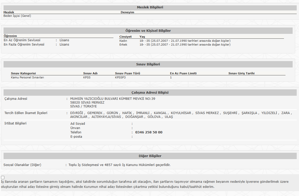 kamu kurum ve kuruluşuna ibraz eder. Belge teslim tarihi ve yeri, ilanda ya