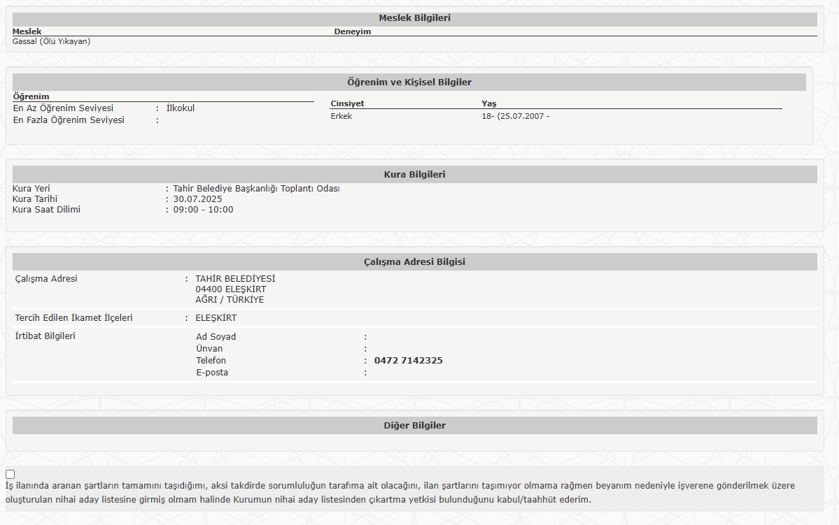 Ağrı Tahir Belediyesi 1 işçi alacak. Son başvuru tarihi 25 Temmuz 2025.