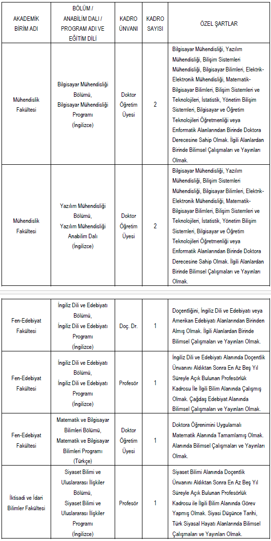Üniversitemizin aşağıda bilgileri belirtilen akademik birimlerine, ilgili ünvanlar için 2547 sayılı Yükseköğretim Kanunu, YÖK Öğretim Üyeliğine Yükseltilme ve Atanma Yönetmeliği ile T.C. İstanbul Kültür Üniversitesi Öğretim Üyeliğine Yükseltilme ve Atanma Yönergesinde belirtilen koşulları yerine getirmiş olmak kaydı ile 657 sayılı Devlet Memurları Kanununun 48 inci maddesindeki genel şartlara sahip olan, aylık ve özlük hakları yönünden 4857 sayılı İş Kanunu hükümlerine tabi olmak üzere devamlı statüde istihdam edilecek Öğretim Üyesi alınacaktır.