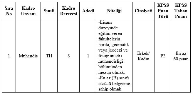Erzincan ili Otlukbeli Belediye Başkanlığı bünyesinde, 657 sayılı Devlet Memurları Kanununa tabi olarak istihdam edilmek üzere; Mahalli İdarelere İlk Defa Atanacaklara Dair Sınav ve Atama Yönetmeliği hükümlerine göre aşağıda unvanı, sınıfı, derecesi, adedi, nitelikleri, KPSS puan türü, KPSS taban puanı ve diğer şartları taşımak kaydıyla, belirtilen boş kadrolara açıktan atama yoluyla memur alınacaktır.