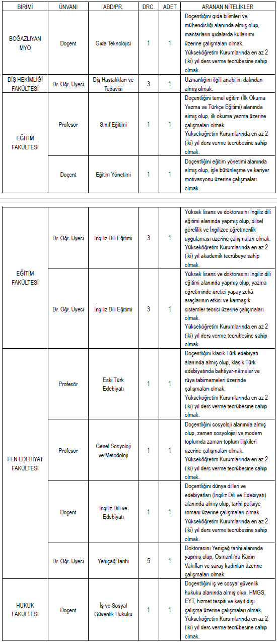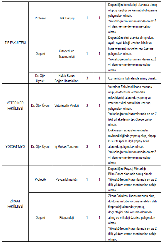 Yozgat Bozok Üniversitesi öğretim üyesi alacak