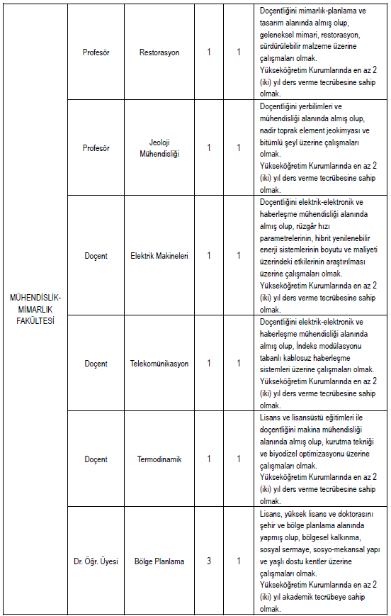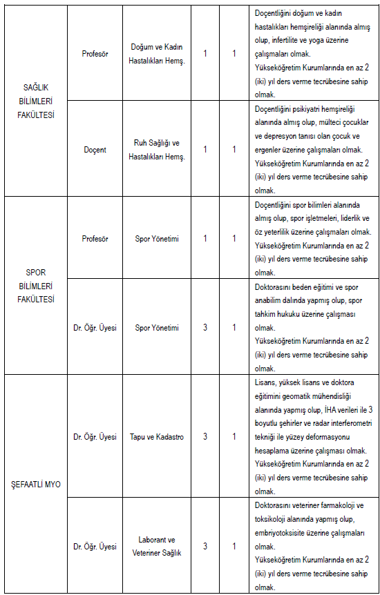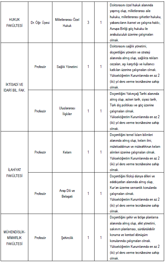 Üniversitemizin aşağıda belirtilen birimlerine, 2547 sayılı Yükseköğretim Kanunu, Öğretim Üyeliğine Yükseltilme ve Atanma Yönetmeliği, 657 sayılı Devlet Memurları Kanununun 48. maddesi ve Üniversitemiz Akademik Yükseltilme ve Atanma Yönergesinde belirtilen şartları sağlayanlardan Öğretim Üyesi alınacaktır.