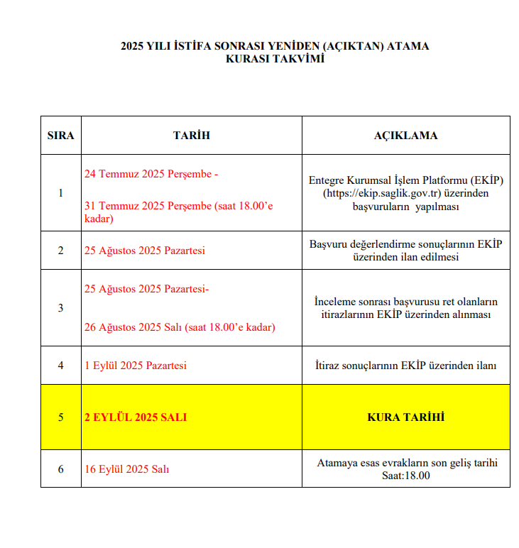 Sağlık Bakanlığı 2025 yılı istifa sonrası yeniden atama kura ilanı. Son başvuru tarihi 31 Temmuz 2025.
