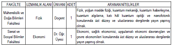 2547 sayılı Yükseköğretim Kanunu ve Öğretim Üyeliğine Yükseltilme ve Atanma Yönetmeliği doğrultusunda, Üniversitemize tam zamanlı öğretim üyeleri alınacaktır. Öğretim Üyeleri kadrolarına başvuracakların; bölümü belirtir dilekçe, nüfus cüzdanı fotokopisi, 2 fotoğraf, özgeçmiş, öğrenim durumunu gösteren belgeler (onaylı suret ve yurt dışından alınan diplomalar için denklik belgesi) YDS ve dengi Yabancı Dil Belgeleri ile bilimsel yayın ve çalışmalarını kapsayan dosyasını iletmesi gerekmektedir. İlana başvurular https://www.sabanciuniv.edu/ tr/akademik-pozisyon-ilanlari web sayfasından alınacaktır. İstenen evraklar linkteki ilgili alanlara yüklenmelidir.