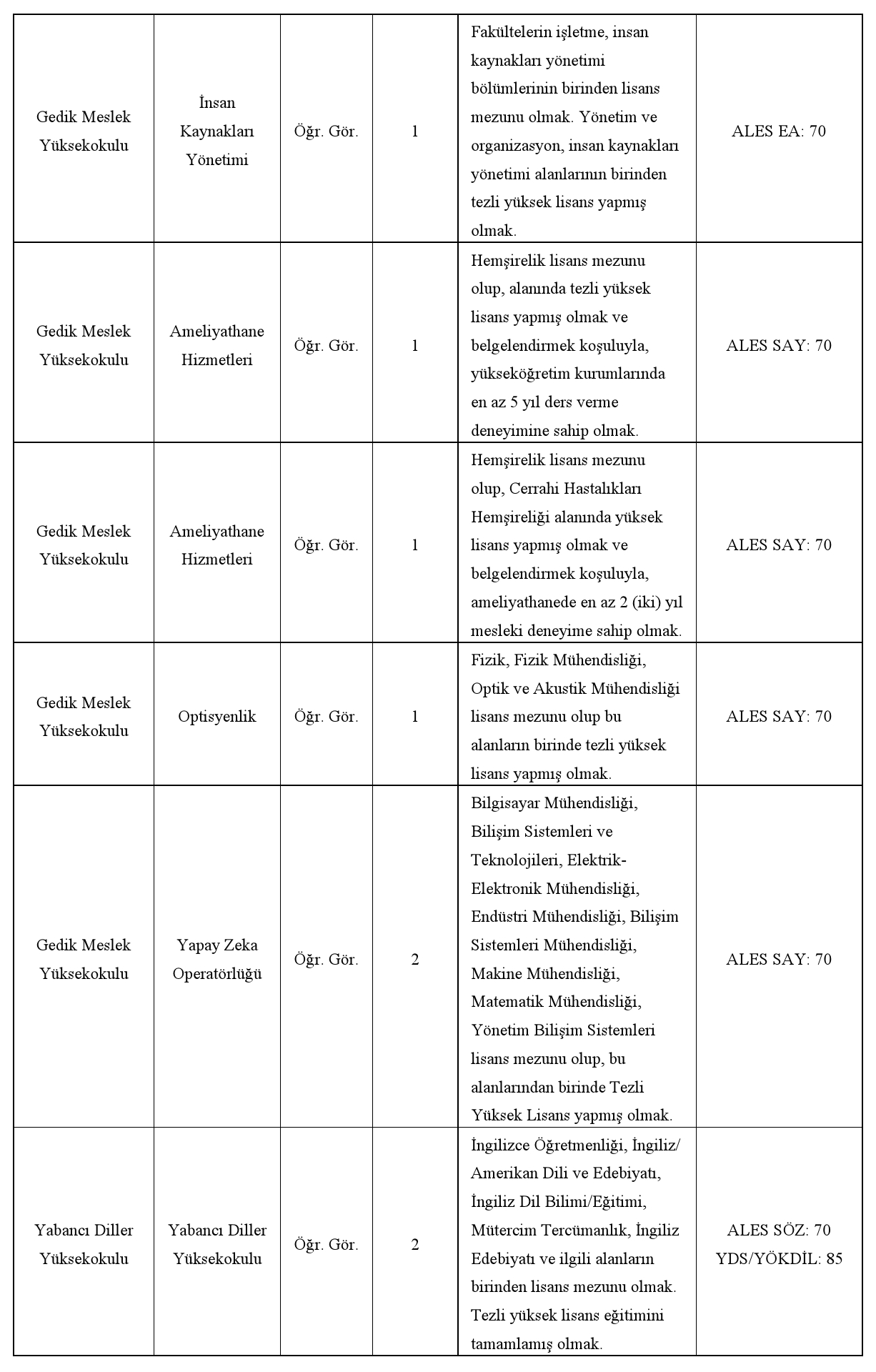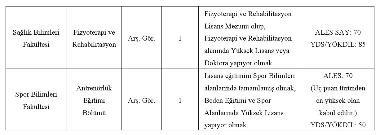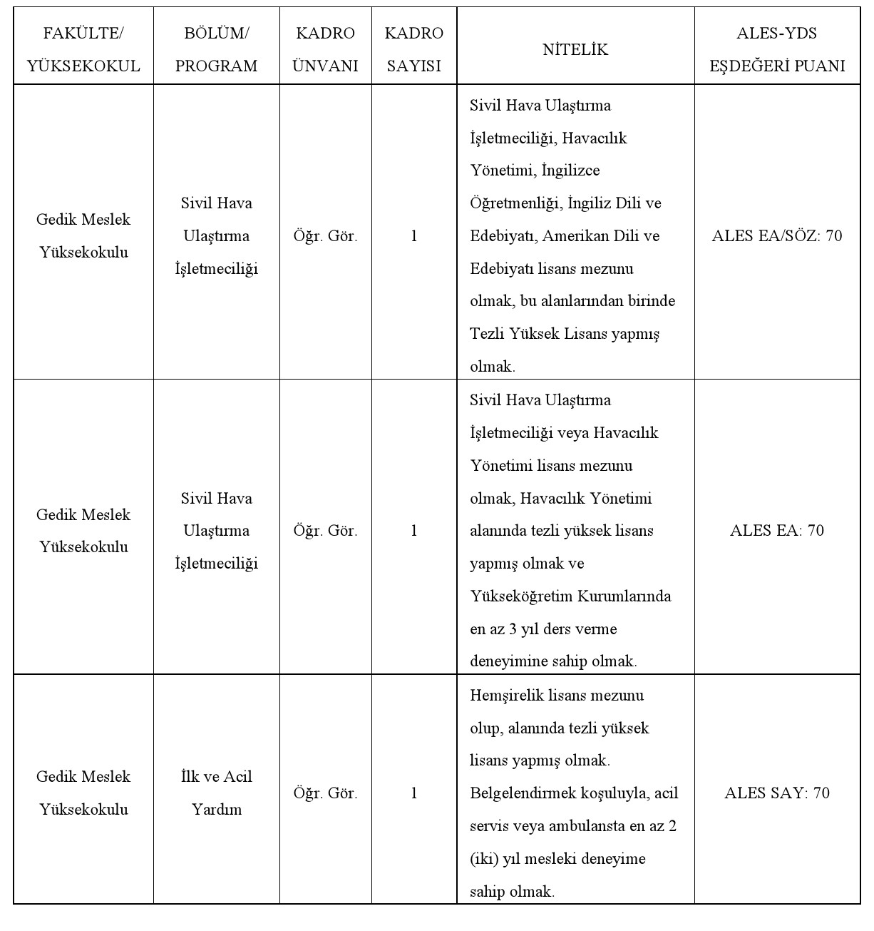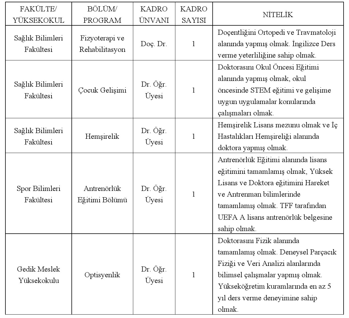 Üniversitemize 2547 sayılı Yükseköğretim Kanunu'nun ve Öğretim Üyesi Dışındaki Öğretim Elemanı Kadrolarına Yapılacak Atamalarda uygulanacak Merkezi Sınav ile Giriş Sınavlarına İlişkin Usul ve Esaslar Hakkında Yönetmelik gereğince öngörülen koşulları sağlamış olmak şartı ile aşağıda belirtilen kadrolara öğretim elemanı alınacaktır.