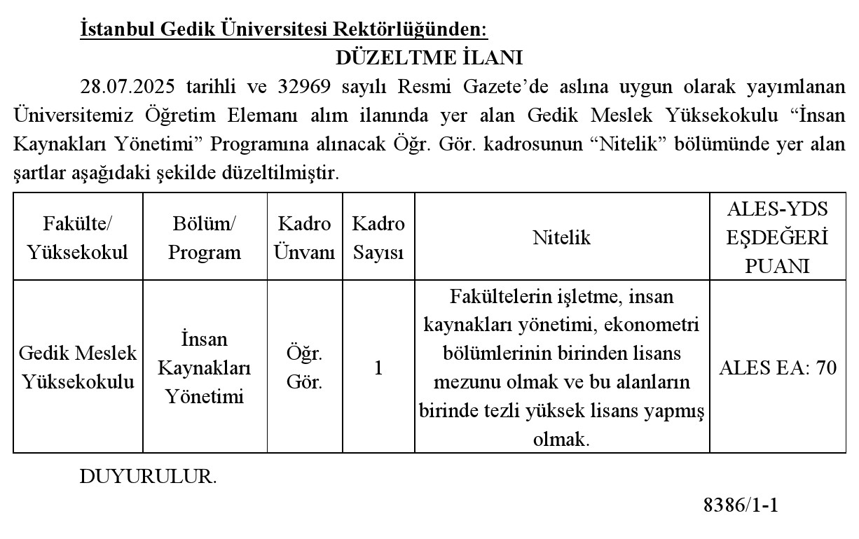 İstanbul Gedik Üniversitesi Rektörlüğünden: