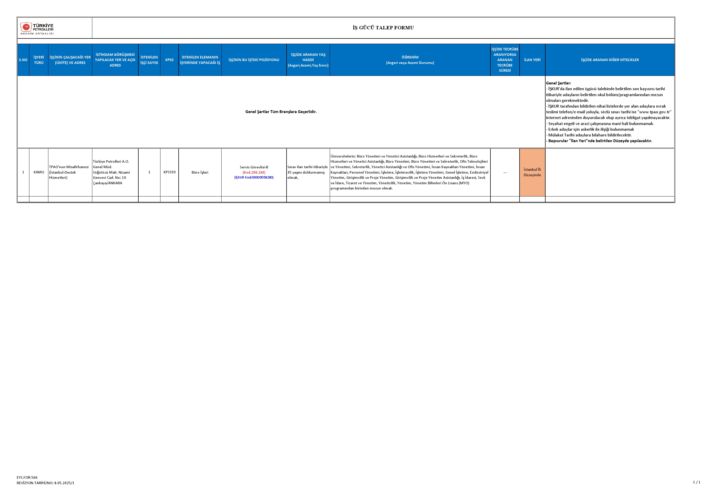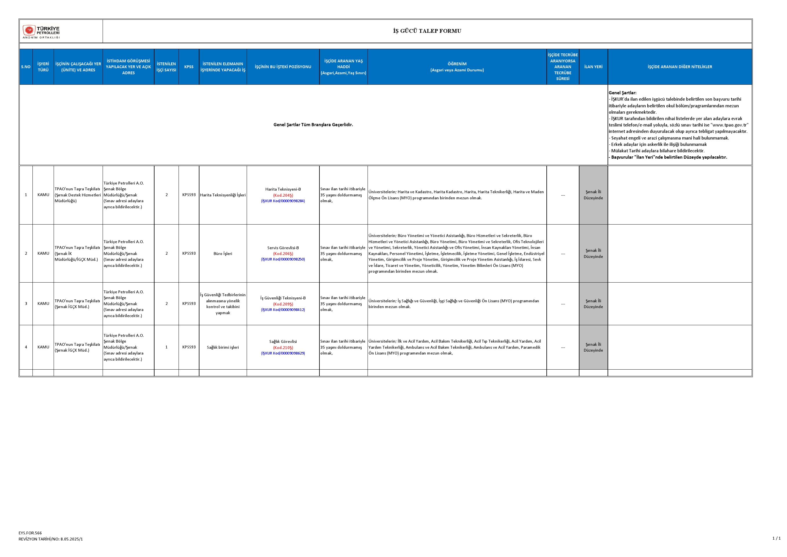 Yürütülen yoğun faaliyetlerle birlikte artan üretim miktarlarına bağlı olarak yeni personel istihdamına ihtiyaç duyan TPAO Şırnak Bölge Müdürlüğüne 7 Ön Lisans mezunu yeni çalışan alımı yapılacaktır.