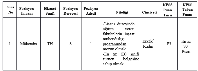 Çankırı ili Kızılırmak Belediye Başkanlığı bünyesinde 5393 sayılı Belediye Kanununun 49 uncu maddesi ile Mahalli İdarelere İlk Defa Atanacaklara Dair Sınav ve Atama Yönetmeliği hükümlerine göre aşağıda unvanı, sınıfı, derecesi, adedi, nitelikleri, KPSS puan türü, KPSS taban puanı ve diğer şartları taşımak kaydıyla, belirtilen boş pozisyona tam zamanlı sözleşmeli personel alınacaktır.