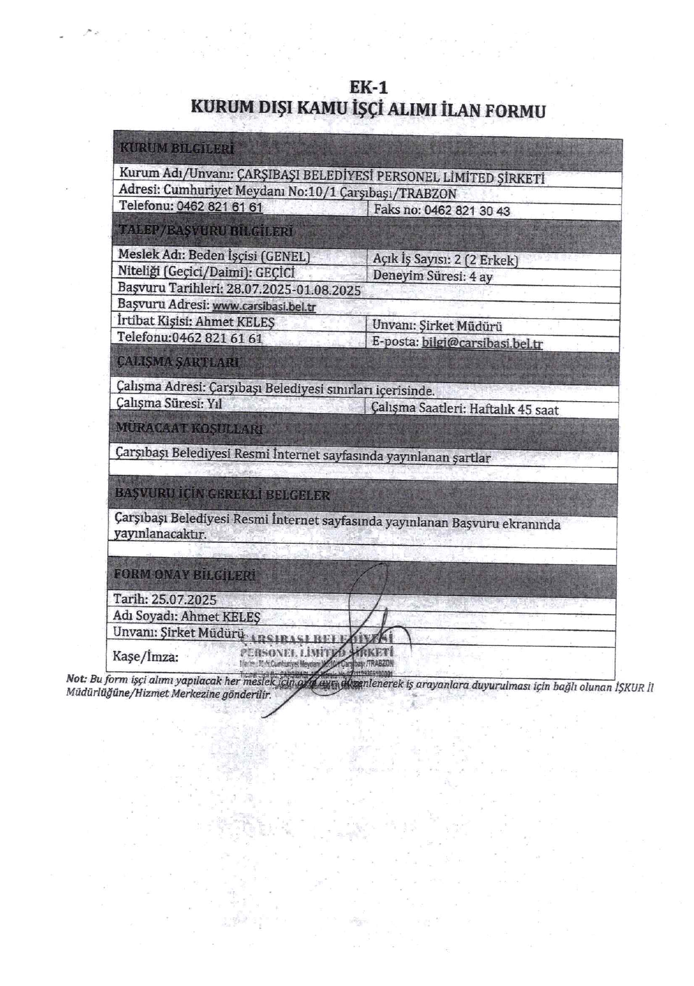 Trabzon Çarşamba Belediyesi Geçici 2 İşçi Alacak. Son başuru tarihi 1 ağustos 2025