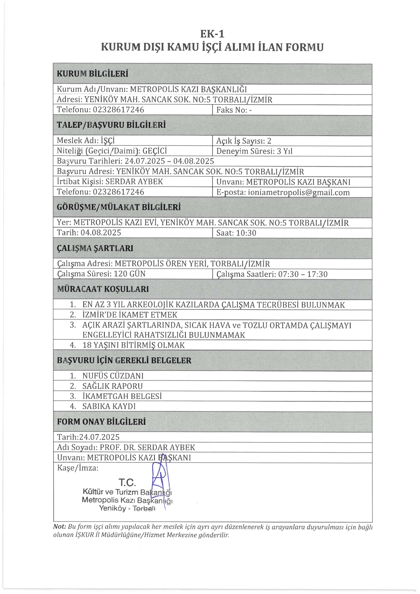 İzmir Torbalı Metropolis Kazı Başkanlığı Geçici 2 İşçi Alacak. Son başuru tarihi 4 ağustos 2025