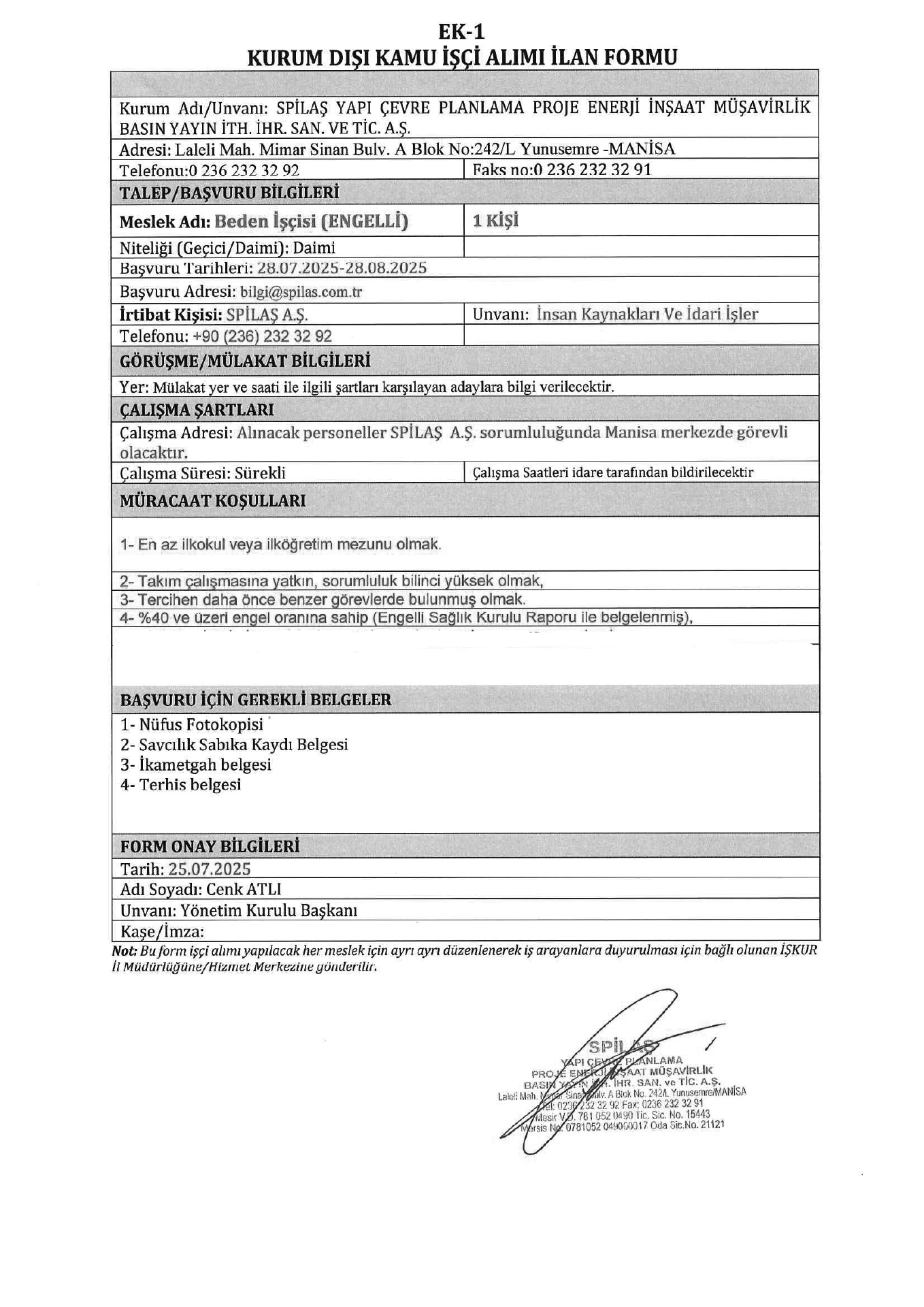 Manisa Spilaş Engelli 1 İşçi Alacak. Son başvuru tarihi 28 ağustos 2025