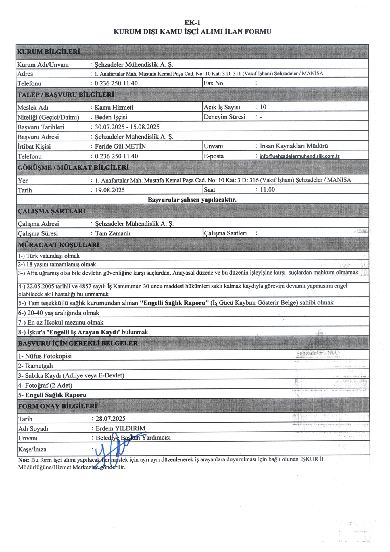 Manisa Şehzadeler Mühendislik 10 İşçi Alacak. Son başvuru tarihi 15 ağustos 2025