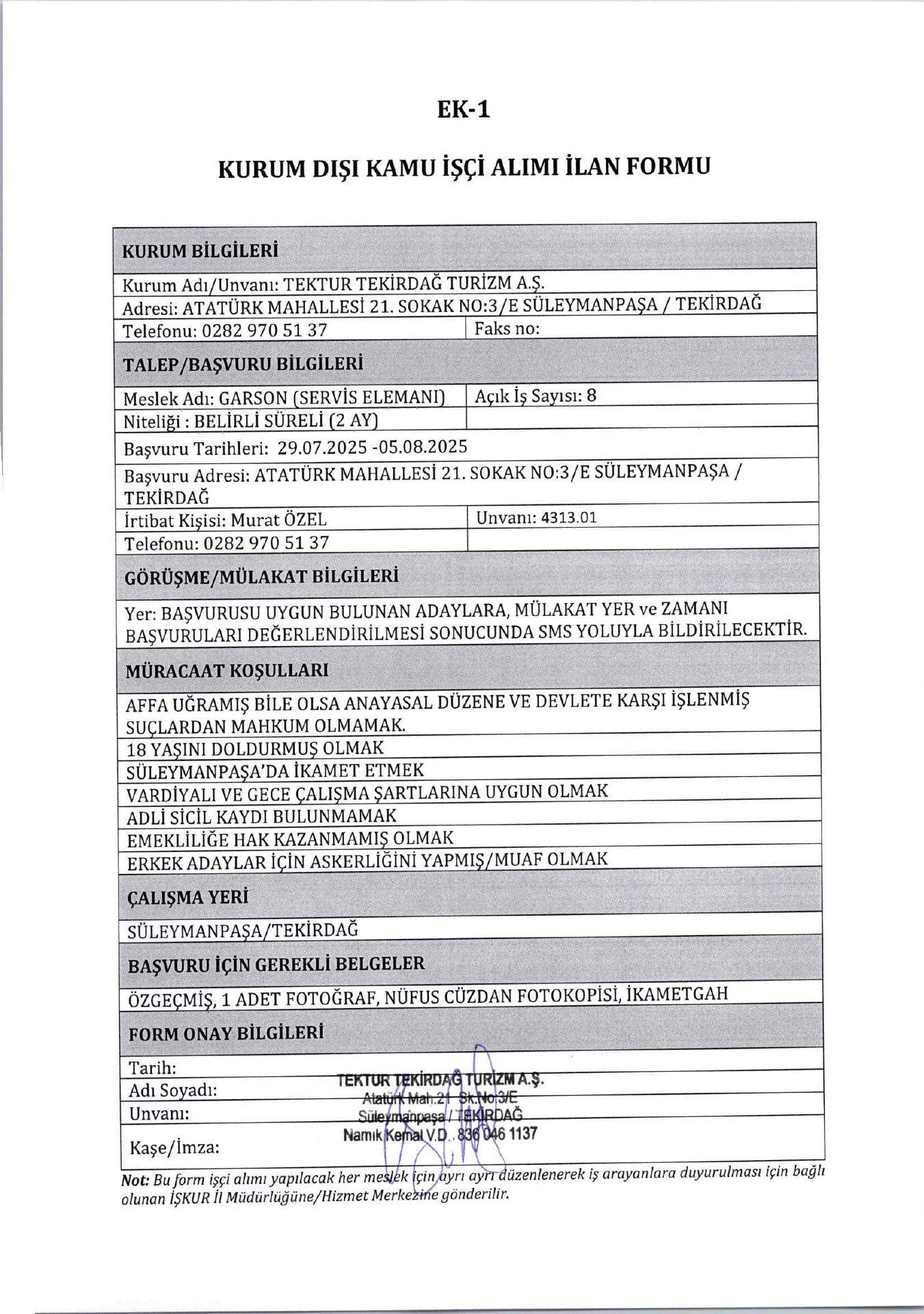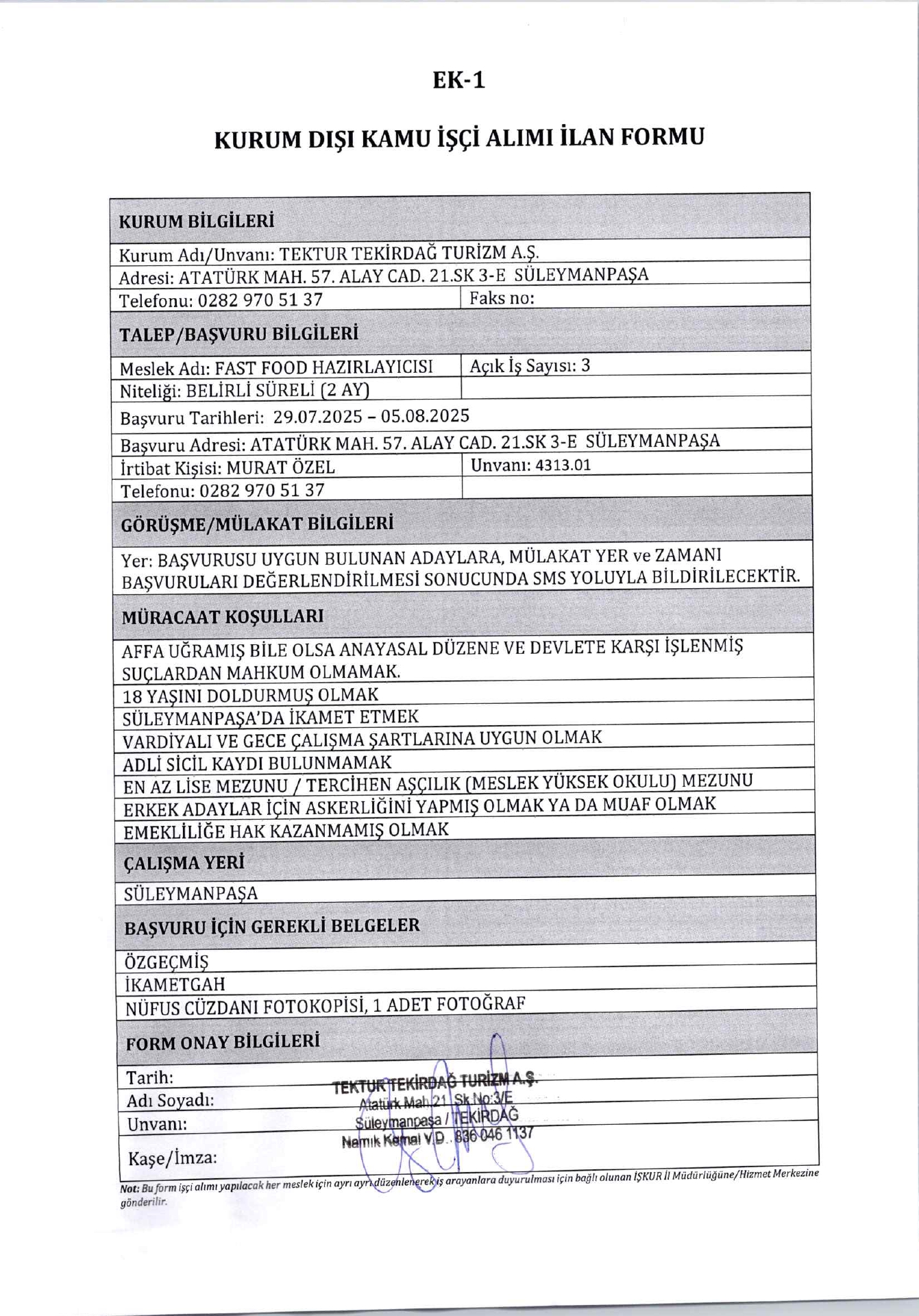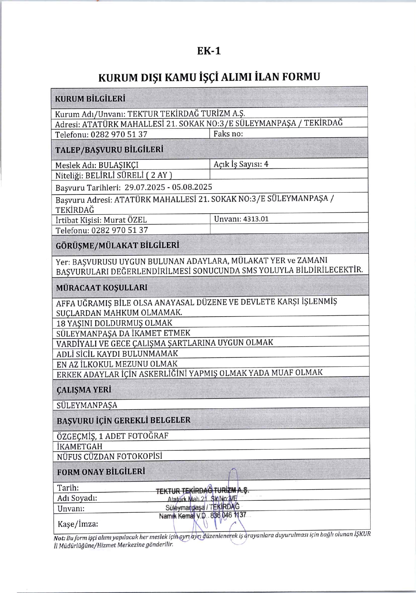 Tekirdağ Tektur Geçici 15 İşçi Alacak. Son başvuru tarihi 05 ağustos 2025