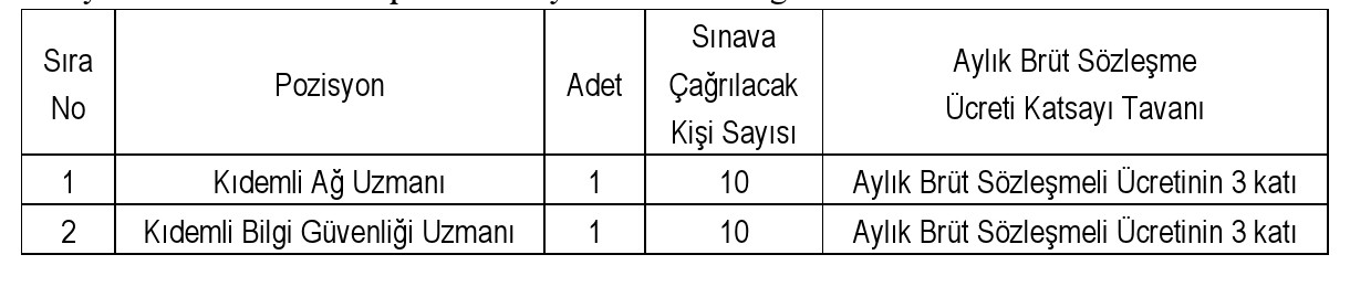 Başvuruların incelenmesinden sonra genel ve özel şartları sağlayan adaylardan KPSSP3 (B) puanının yüzde yetmişi (KPSS puanı olmayan veya belge ibraz etmeyen adayın KPSS puanı 70 (yetmiş) olarak dikkate alınır.) ile yabancı dil puanının yüzde otuzunun [belge ibraz etmeyenlerin yabancı dil puanı 0 (sıfır) olarak değerlendirilir] toplamı esas alınarak, sınava katılma şartlarını taşıyan ve usulüne uygun olarak başvuranlar arasından yapılacak sıralamaya göre en yüksek puanlıdan başlamak üzere sözleşmeli bilişim personeli pozisyon adedinin(Kıdemli Ağ Uzmanı, Kıdemli Bilgi Güvenliği Uzmanı) her birinin 10 (on) katı aday sınava alınacaktır. Bu sıralamaya göre son sırada aynı puana sahip birden fazla adayın bulunması halinde, bu kişilerin tamamı sınava kabul edilir.