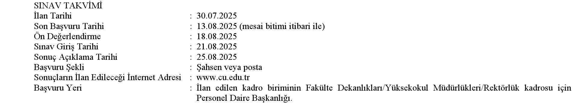İlanda belirtilen kadrolara başvurular, ilanın yayım tarihi itibariyle saat 08.00'dan, 15'inci günün sonunda saat 23.59'a kadar https://absis.cu.edu.tr/ internet adresinden çevrim içi olarak yapılacak olup, başvuru süresi içinde yapılmayan ve belirtilen koşulları taşımayan başvurular kabul edilmeyecektir. Ayrıca şahsen veya posta ile yapılan başvurular da kabul edilmeyecektir.