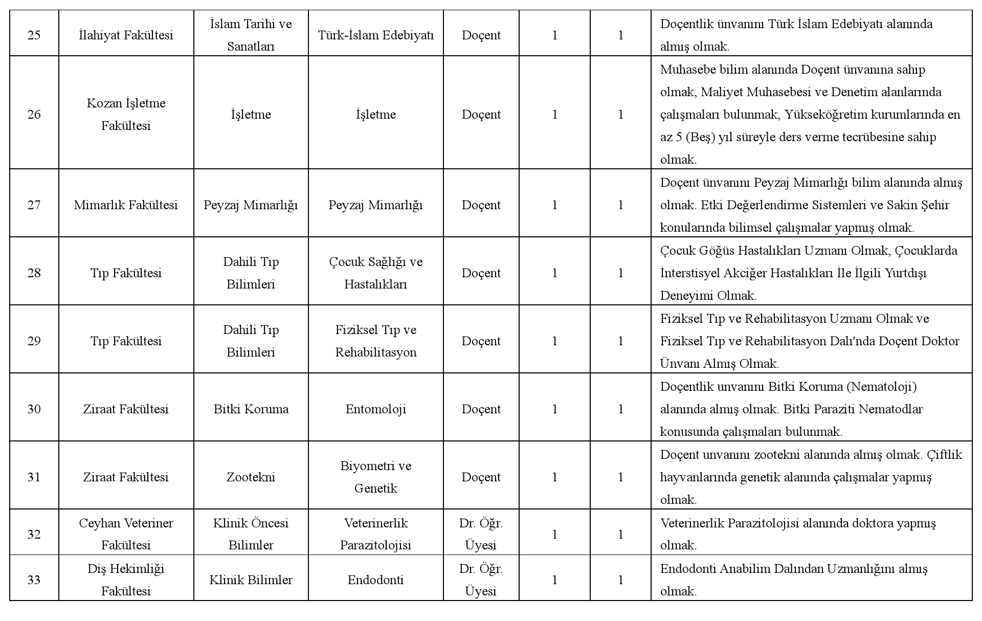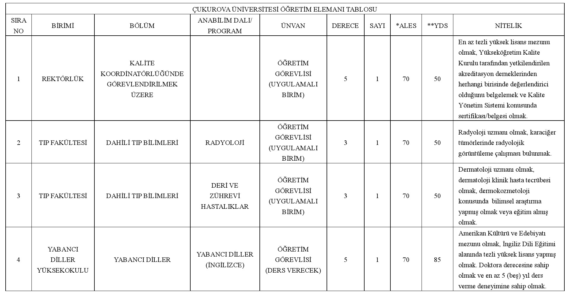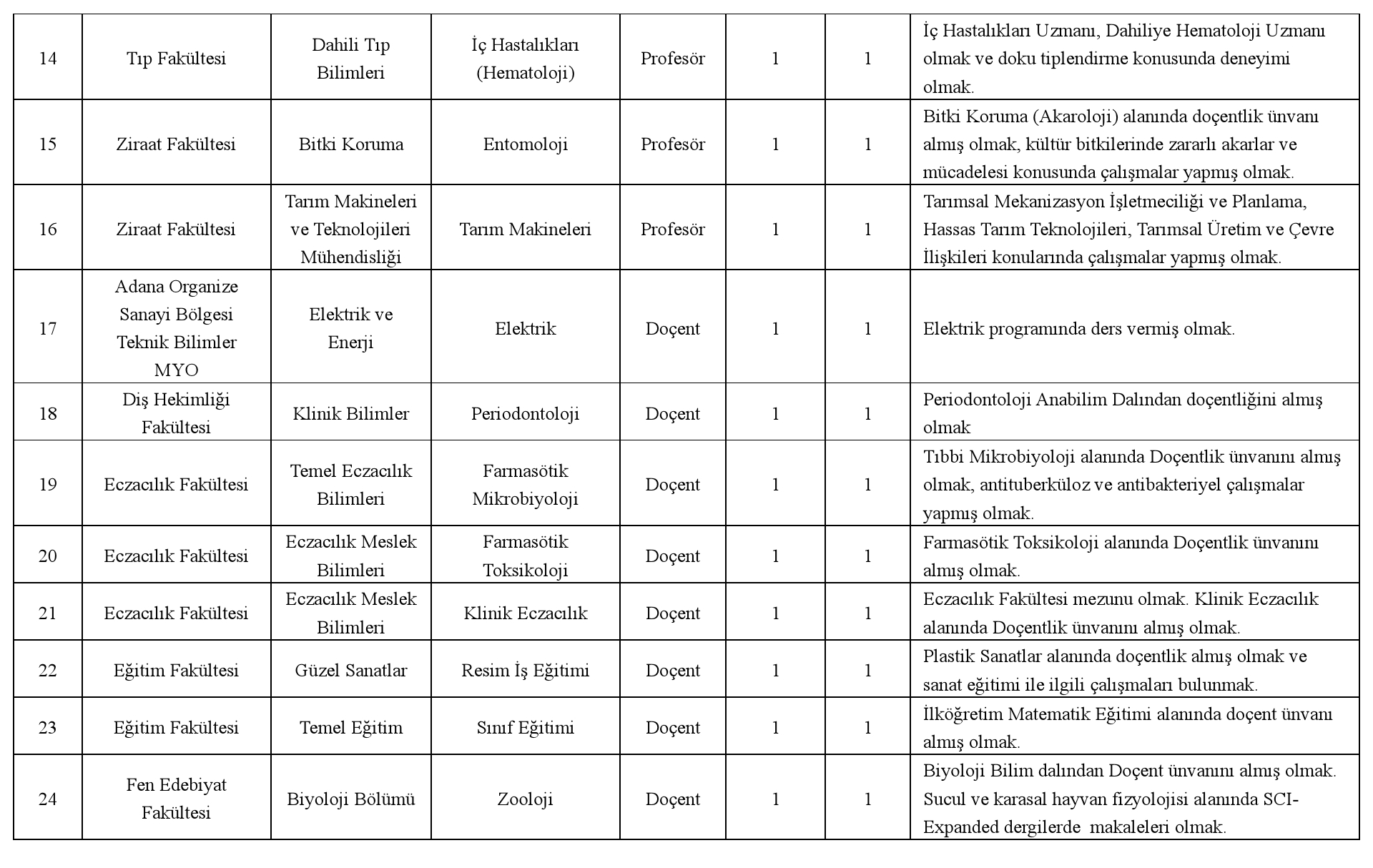 Üniversitemizin aşağıda belirtilen birimlerine 2547 sayılı Yükseköğretim Kanununun ilgili maddeleri, Öğretim Üyeliğine Yükseltilme ve Atanma Yönetmeliği ve Çukurova Üniversitesi Öğretim Üyesi Kadrolarına Atama ve Yükseltilme Ölçütleri uyarınca asgari şartlara haiz, Öğretim Üyeleri (Profesör, Doçent ve Doktor Öğretim Üyesi kadrolarına) alınacaktır. Doktor Öğretim Üyesi kadrosuna başvuracak adayların Çukurova Üniversitesi Öğretim Üyesi Kadrolarına Atama ve Yükseltilme Ölçütlerini; Doçent ve Profesör kadrolarına başvuracak adayların ise Çukurova Üniversitesi Öğretim Üyeliğine Yükseltilme ve Atanma Ölçütleri'ni dikkate alması gerekmektedir.