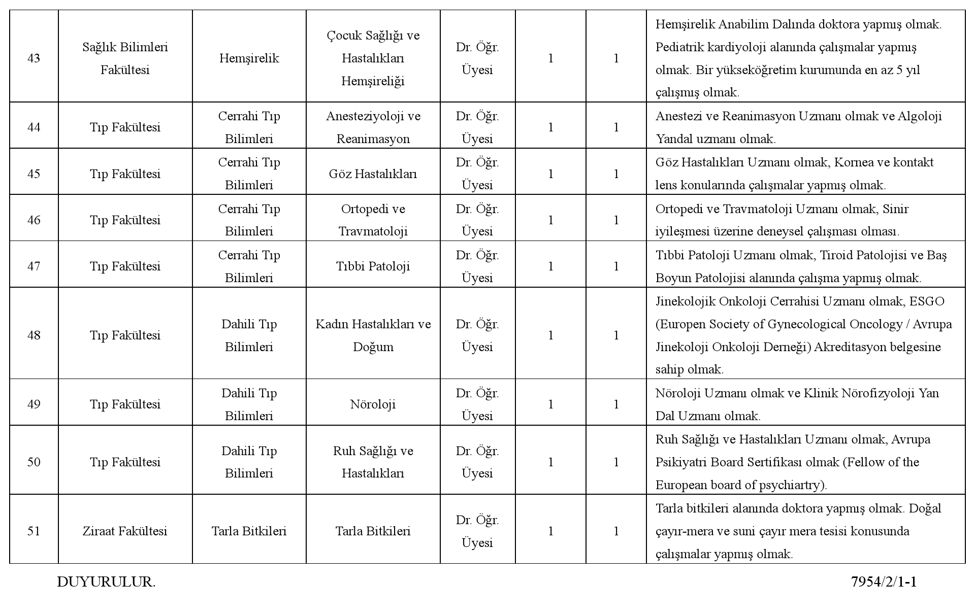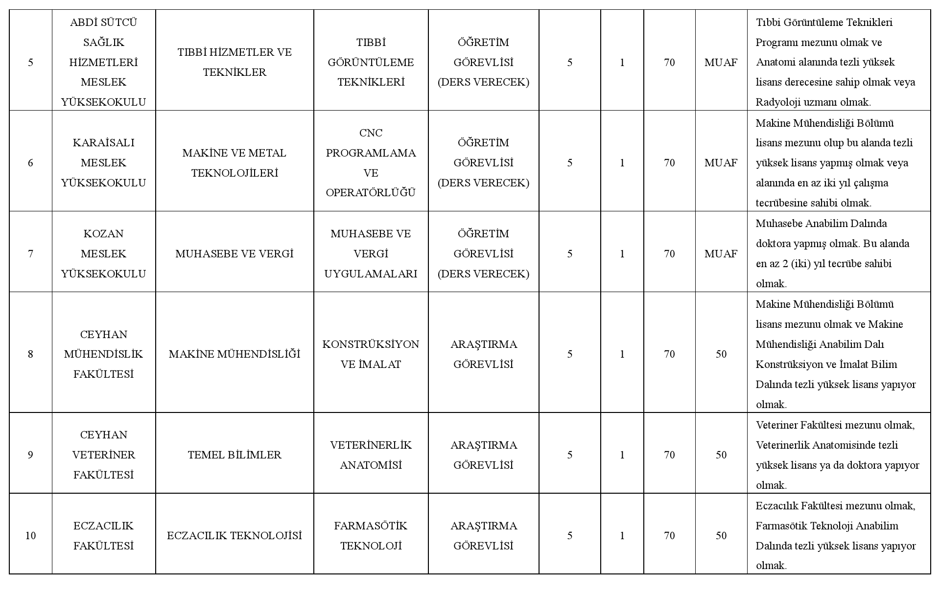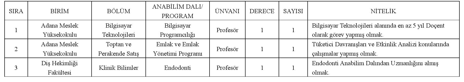 Üniversitemizin aşağıda belirtilen birimlerine 2547 sayılı Yükseköğretim Kanununun ilgili maddeleri, Öğretim Üyeliğine Yükseltilme ve Atanma Yönetmeliği ve Çukurova Üniversitesi Öğretim Üyesi Kadrolarına Atama ve Yükseltilme Ölçütleri uyarınca asgari şartlara haiz, Öğretim Üyeleri (Profesör, Doçent ve Doktor Öğretim Üyesi kadrolarına) alınacaktır. Doktor Öğretim Üyesi kadrosuna başvuracak adayların Çukurova Üniversitesi Öğretim Üyesi Kadrolarına Atama ve Yükseltilme Ölçütlerini; Doçent ve Profesör kadrolarına başvuracak adayların ise Çukurova Üniversitesi Öğretim Üyeliğine Yükseltilme ve Atanma Ölçütleri'ni dikkate alması gerekmektedir.