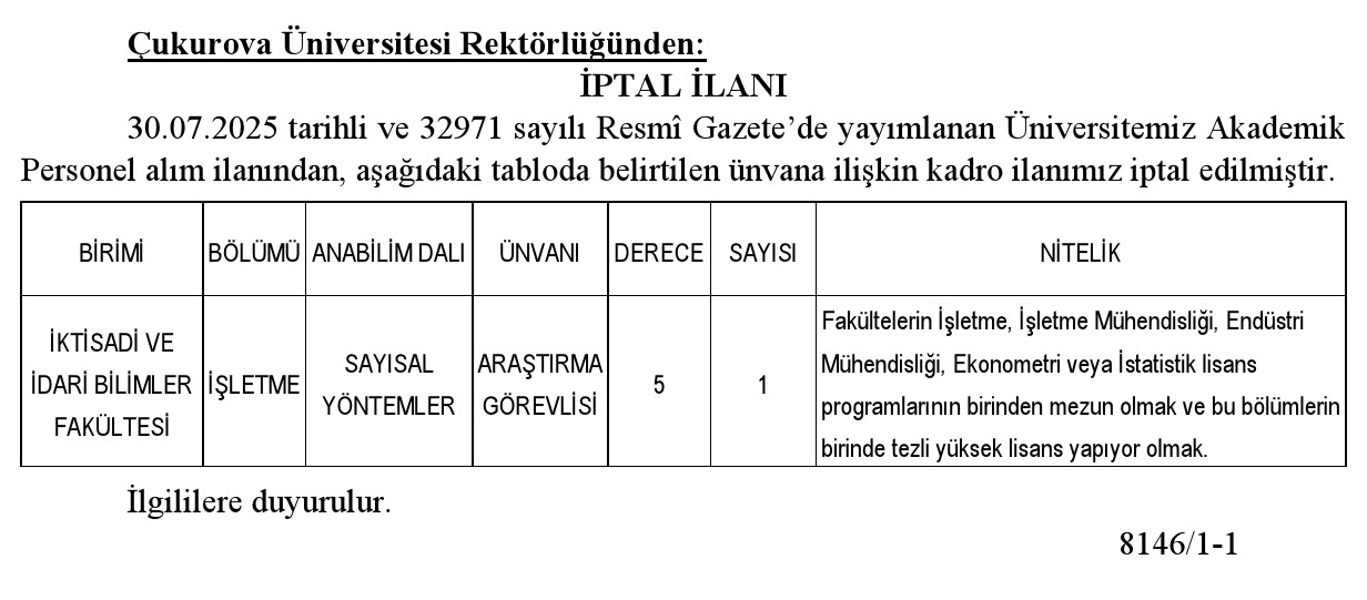 Çukurova Üniversitesi Öğretim Üyesi ve Elemanı Alım İlanı. Son başvuru tarihi 13 ağustos 2025