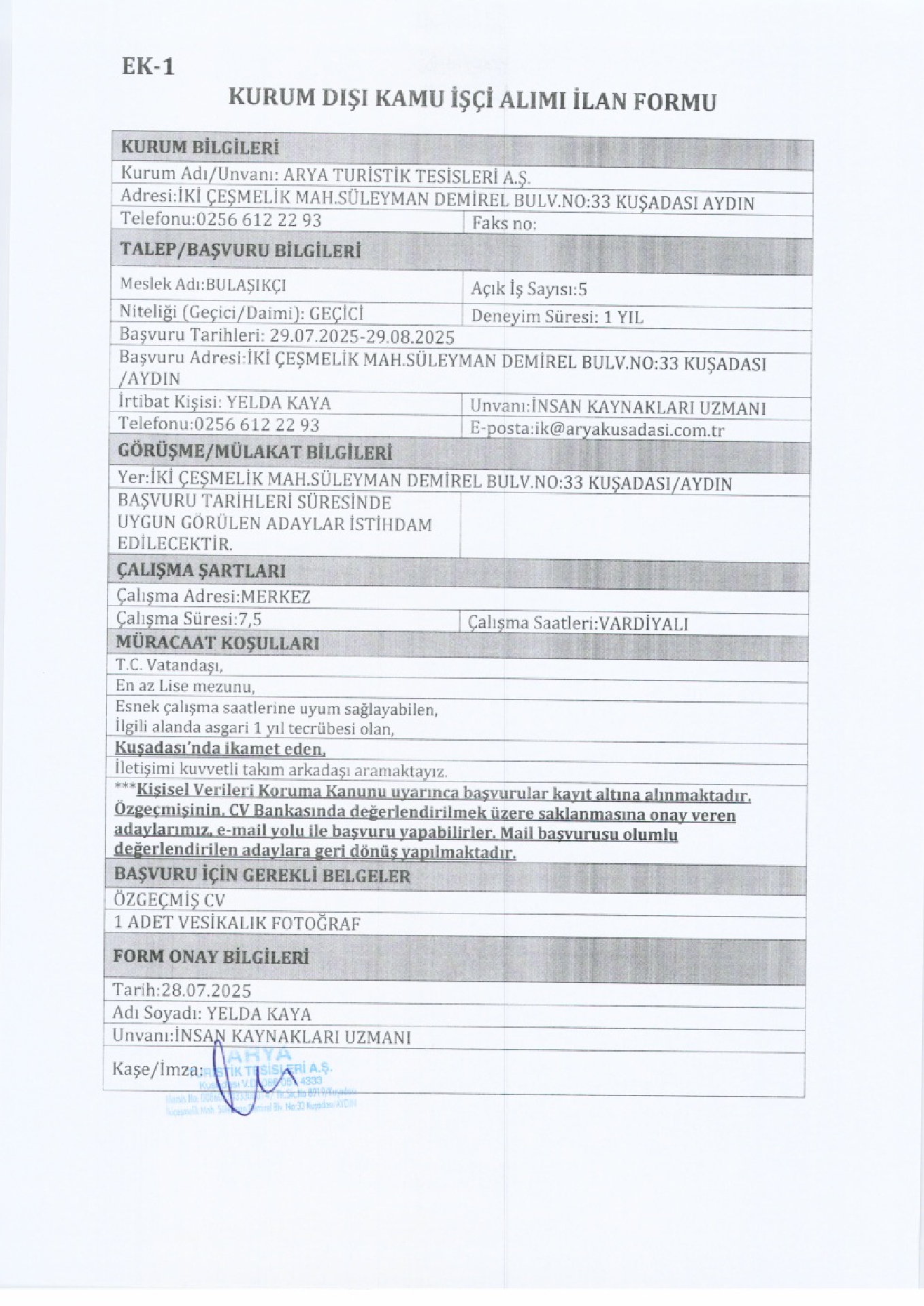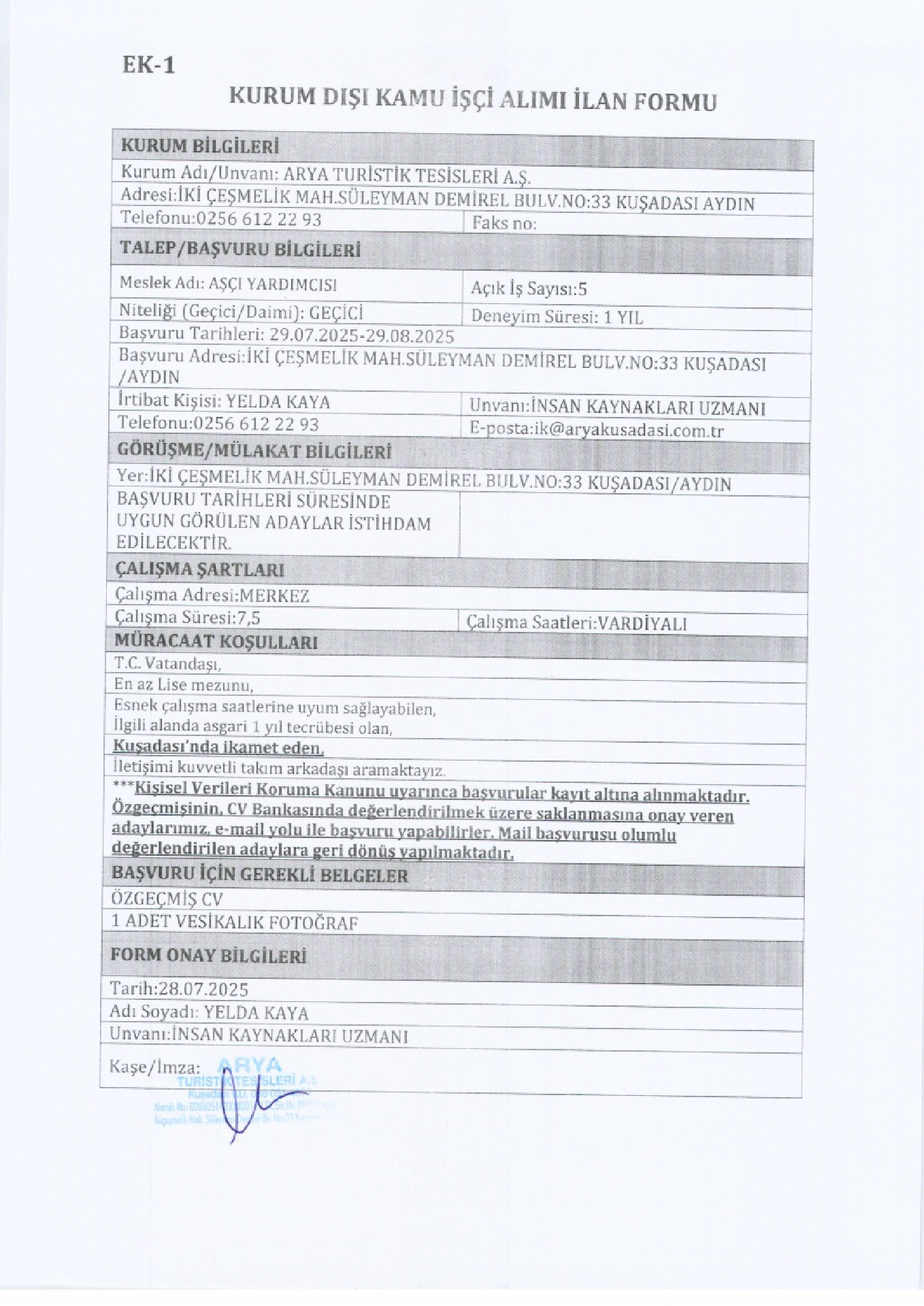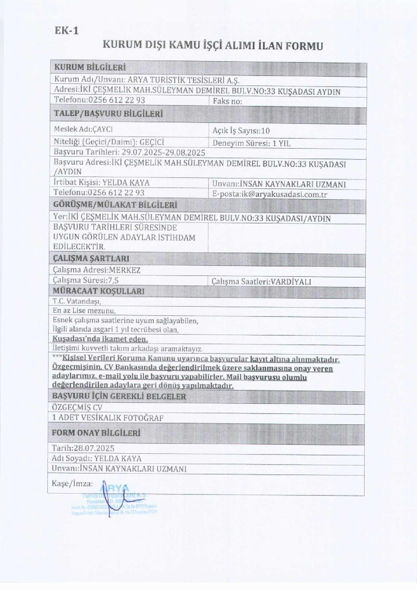 Aydın Kuşadası Arya Turistik Geçici 69 İşçi Alacak. Son başvuru tarihi 29 ağustos 2025