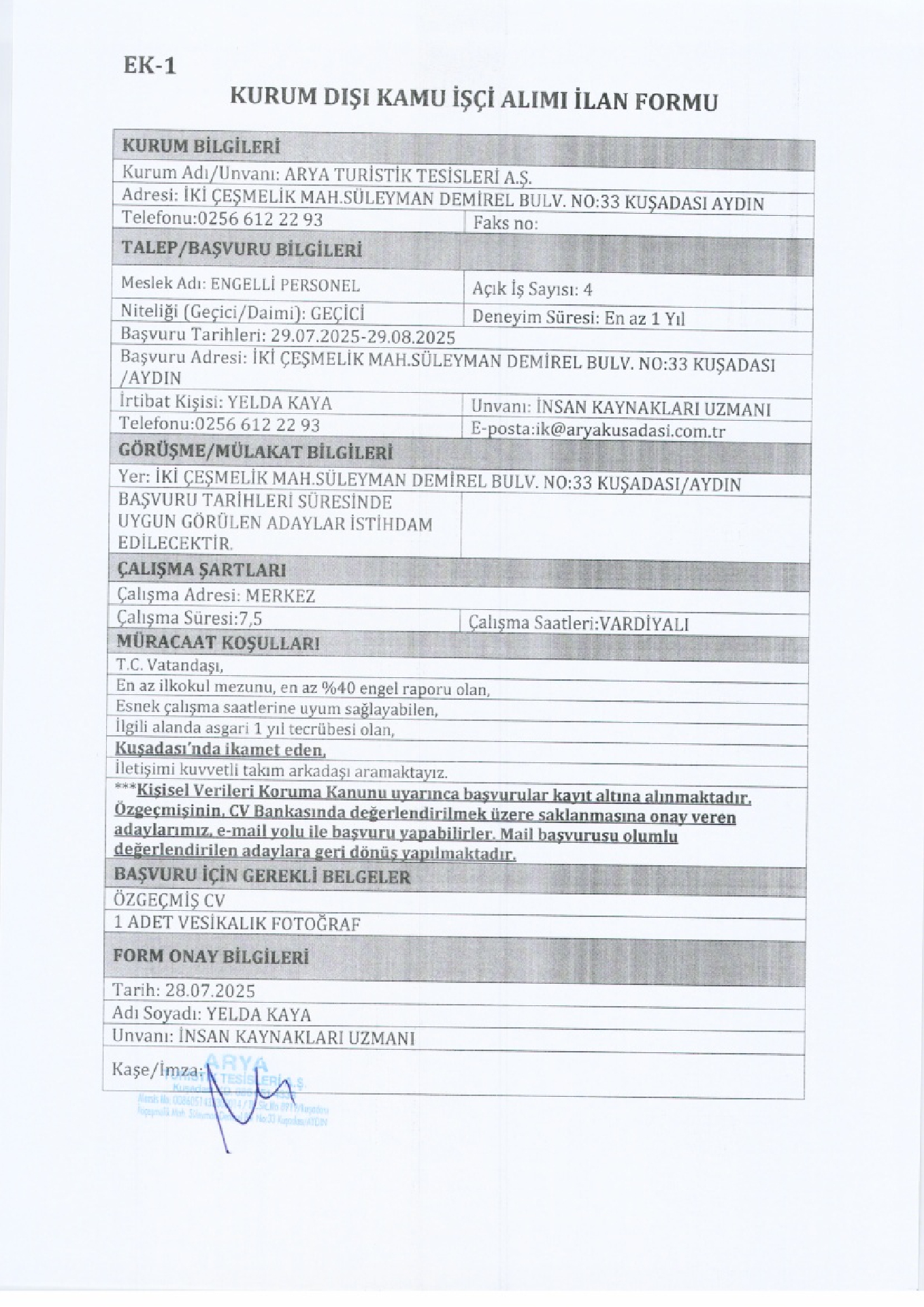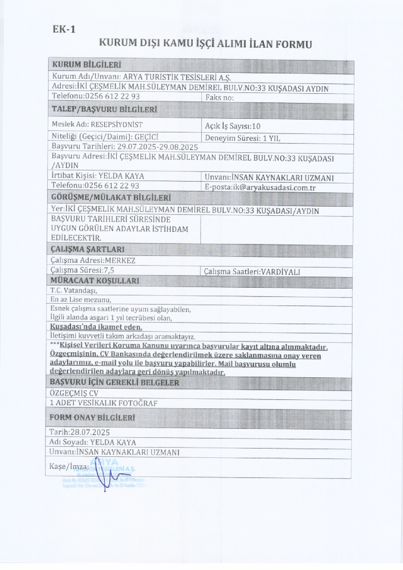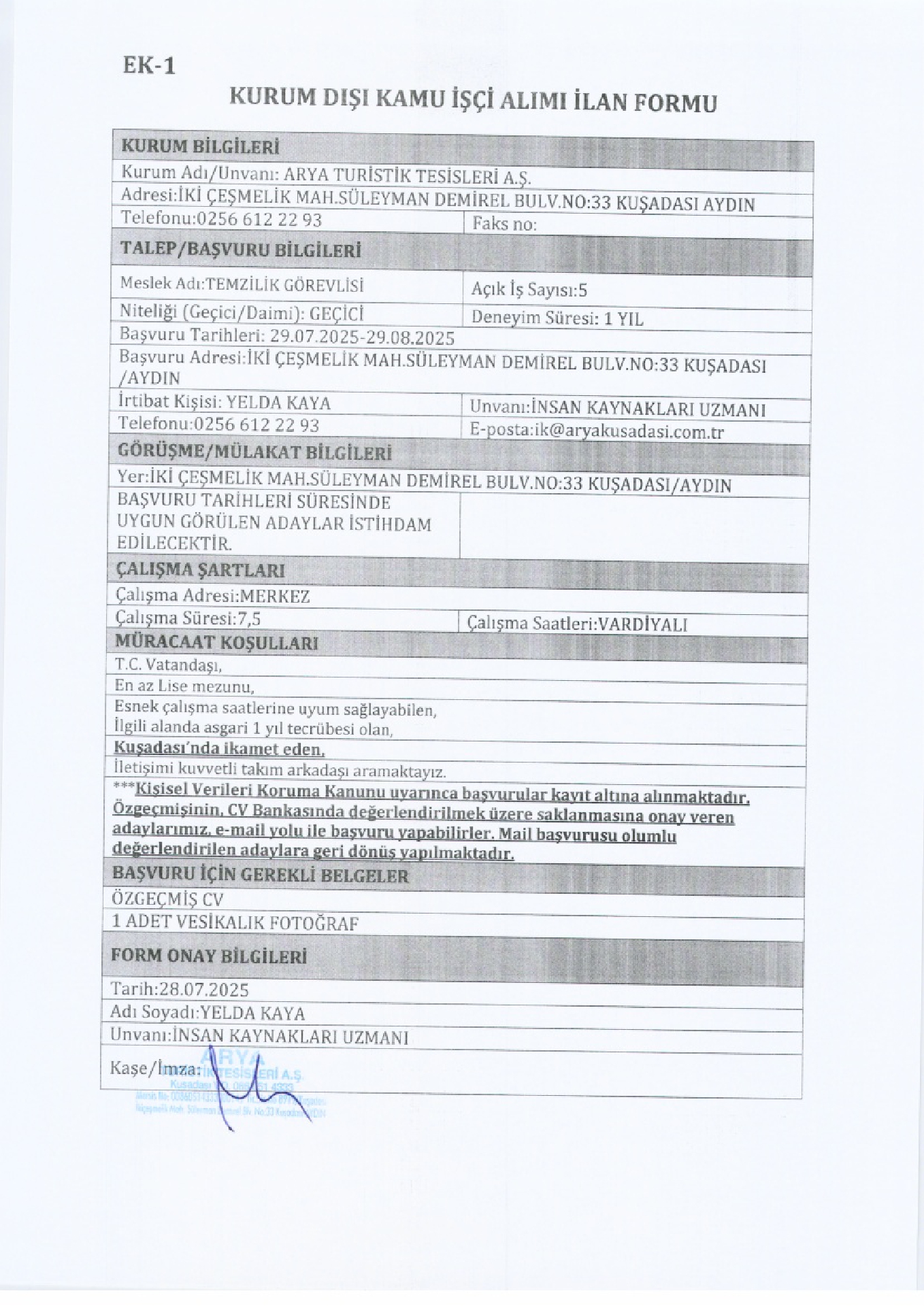 Aydın Kuşadası Arya Turistik Geçici 69 İşçi Alacak. Son başvuru tarihi 29 ağustos 2025