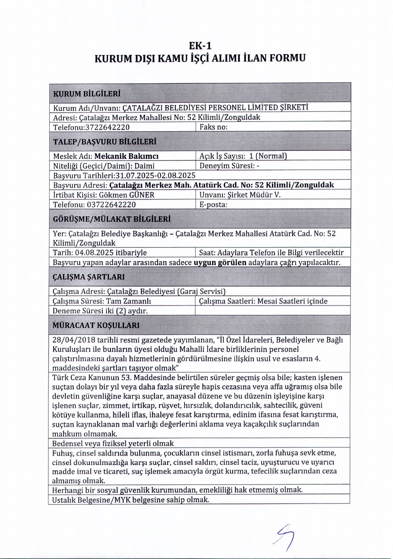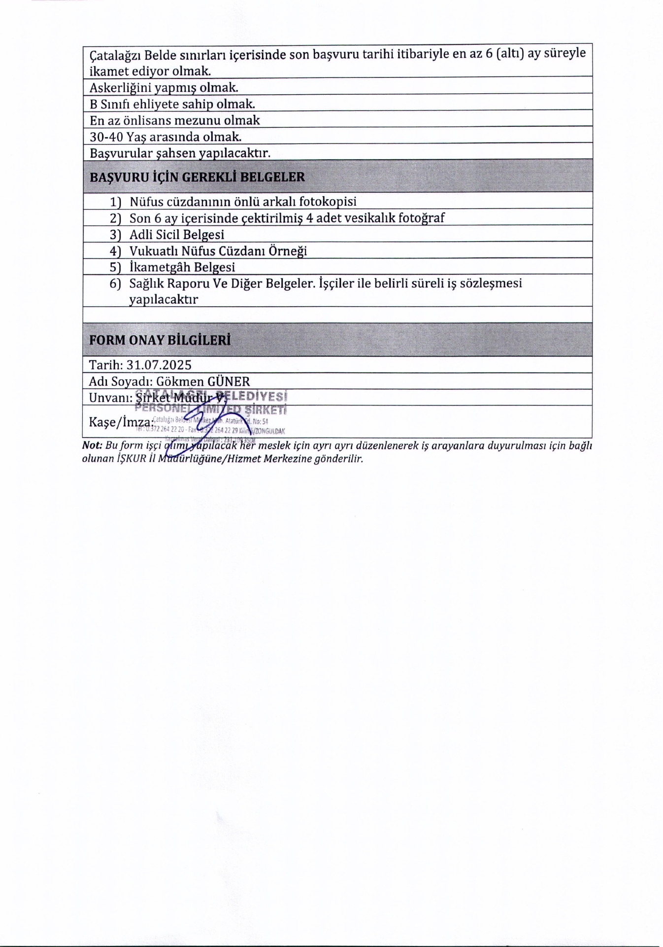Zonguldak Çatalağzı Belediyesi 1 İşçi Alacak. Son başvuru tarihi 02 ağustos 2025