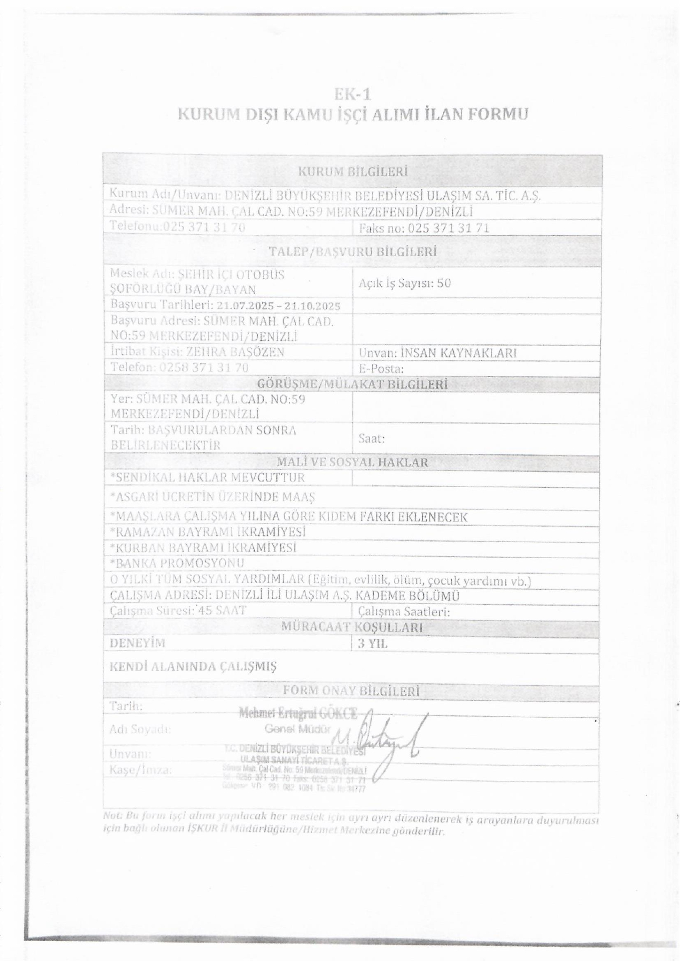 Denizli Büyükşehir Belediyesi 50 İşçi Alacak. Son başvuru tarihi 10 kasım 2025