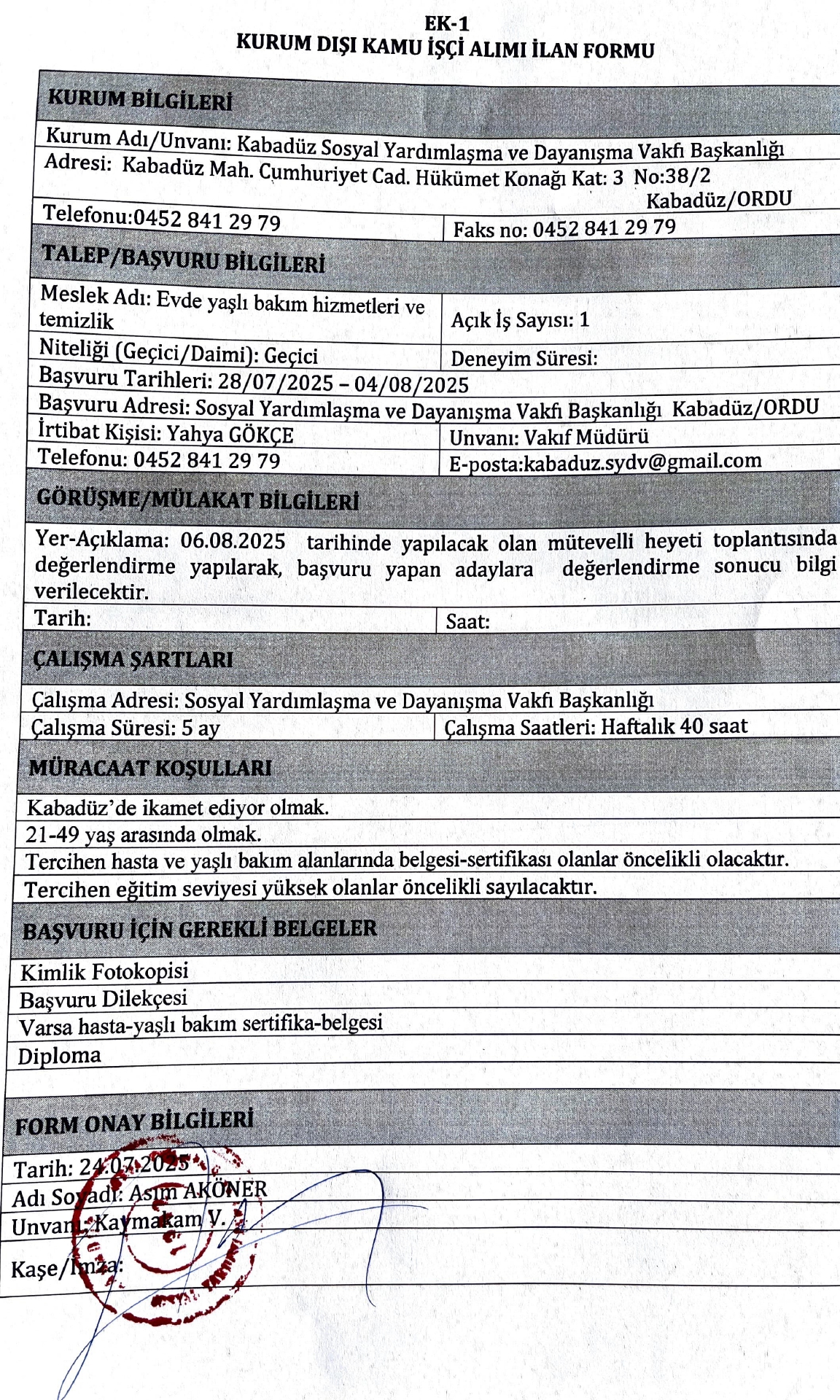 Ordu Kabadüz SYDV Geçici 1 İşçi Alacak. Son başvuru tarihi 04 ağustos 2025