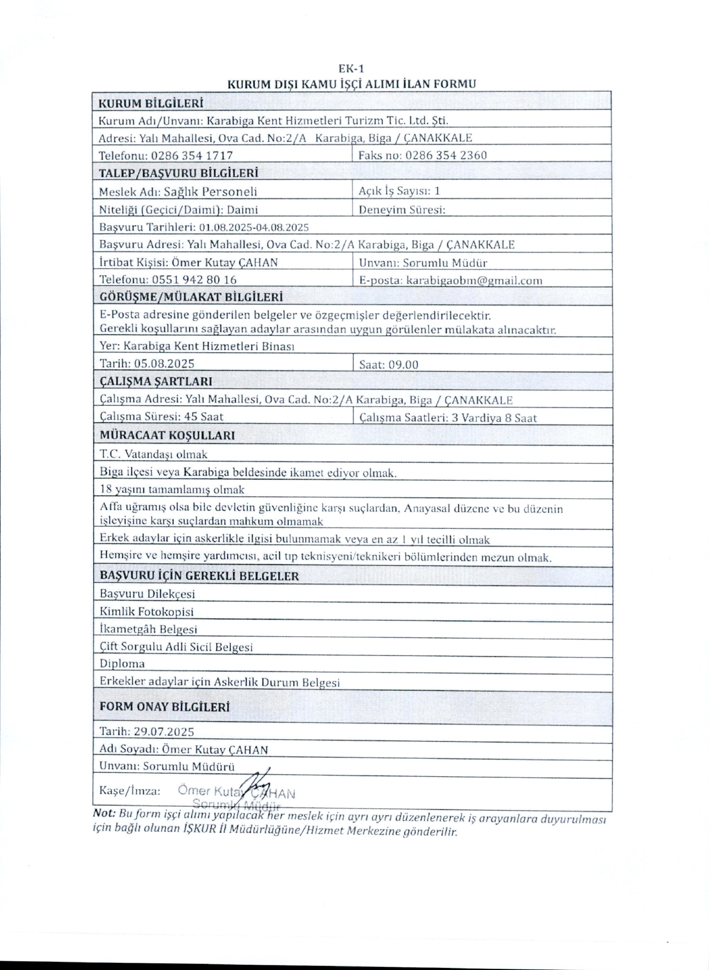 Çanakkale Karabiga Kent Hizmetleri 1 İşçi Alacak. Son başvuru tarihi 04 ağustos 2025