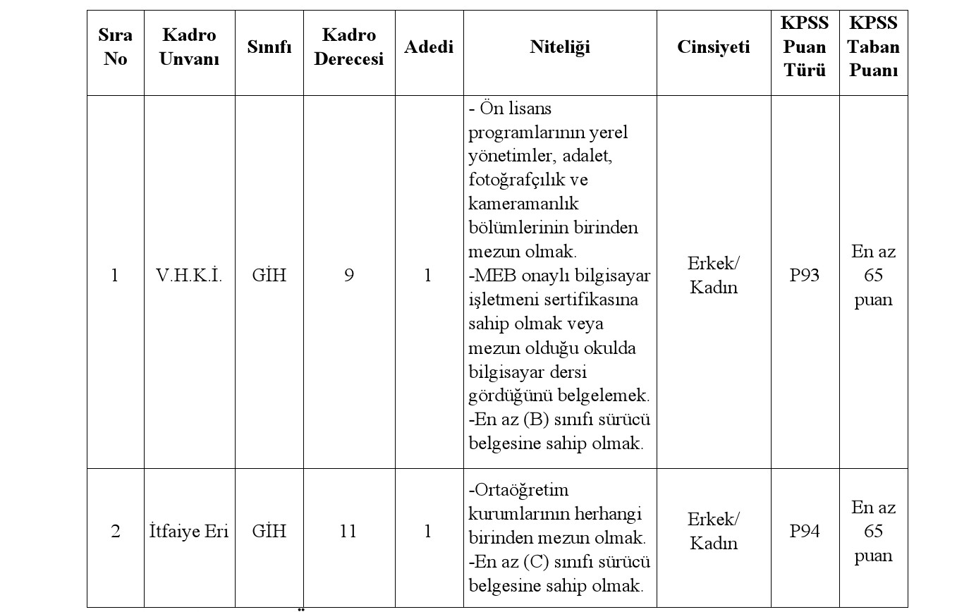 Afyonkarahisar ili Güney Belediye Başkanlığı bünyesinde 657 sayılı Devlet Memurları Kanununa tabi olarak istihdam edilmek üzere; Mahalli İdarelere İlk Defa Atanacaklara Dair Sınav ve Atama Yönetmeliği ile Belediye İtfaiye Yönetmeliği hükümlerine göre aşağıda unvanı, sınıfı, derecesi, adedi, nitelikleri, KPSS puan türü, KPSS taban puanı ve diğer şartları taşımak kaydıyla, belirtilen boş kadrolara açıktan atama yoluyla memur ve itfaiye eri alınacaktır.