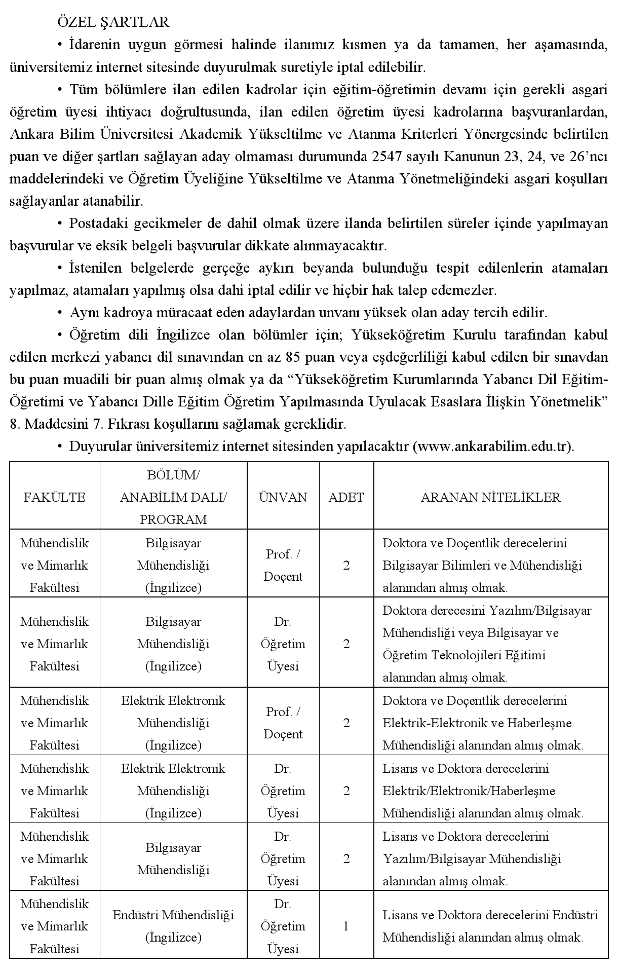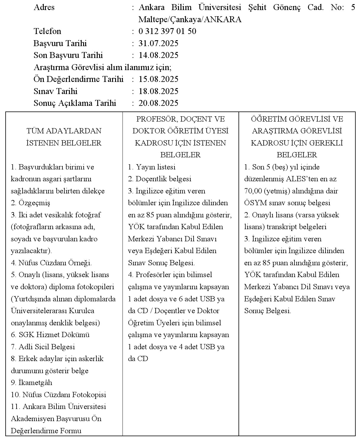 Ankara Bilim Üniversitesi Öğretim Üyesi Alım İlanı. Son başvuru tarihi 14 ağustos 2025
