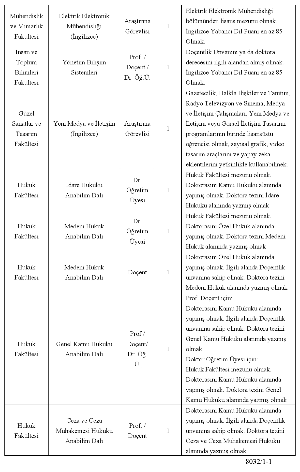 Yönergesinde aranan koşulları yerine getirmiş olmak kaydı ile aylık ve özlük hakları yönünden 4857 sayılı İş Kanunu hükümlerine tabi olarak aşağıda belirtilen bölümlere öğretim üyeleri alınacaktır. İlana konu olan kadrolar tam zamanlıdır. Müracaat edecek adayların ilgili yönetmelik