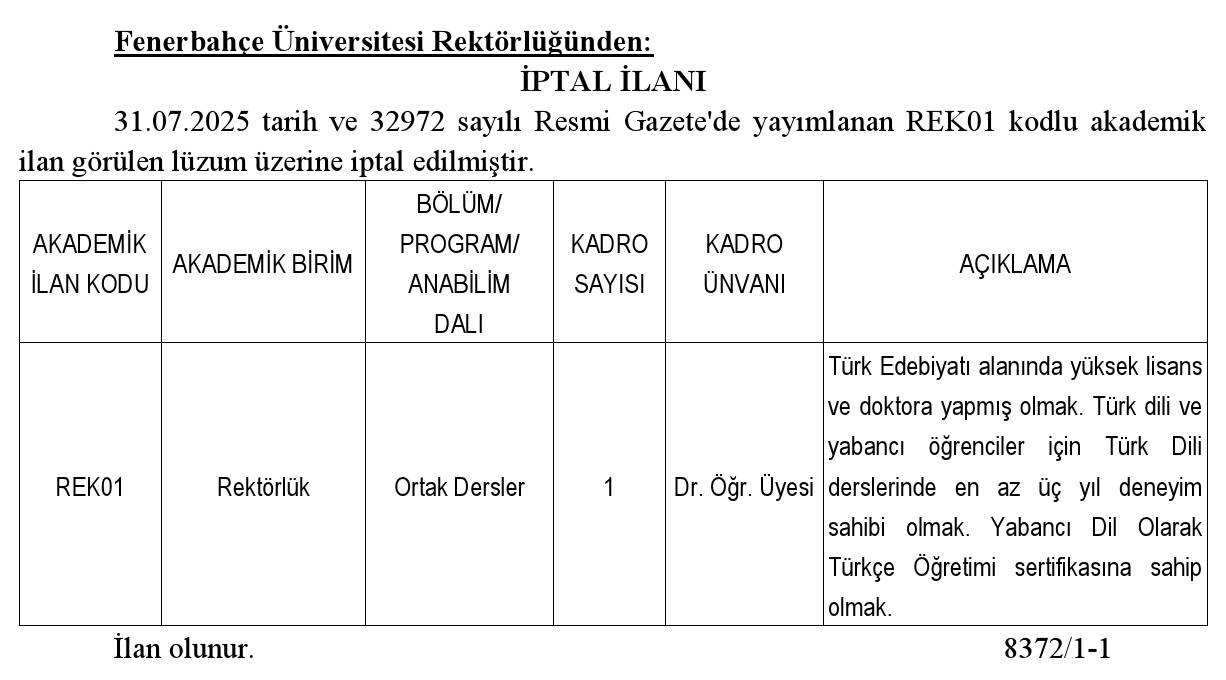 Fenerbahçe Üniversitesi Rektörlüğünden: