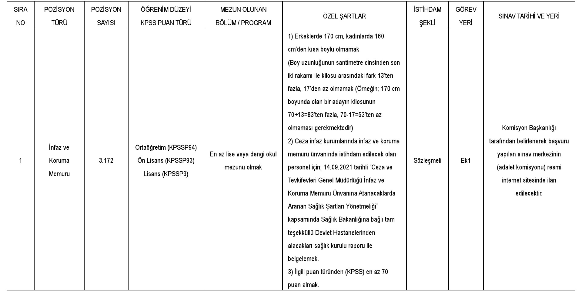 657 sayılı Devlet Memurları Kanunu'nun 4'üncü maddesinin (B) fıkrası, 2802 sayılı Hakimler ve Savcılar Kanununun 114'üncü maddesi, Genel Kadro ve Usulü Hakkında 2 Nolu Cumhurbaşkanlığı Kararnamesinin 8 ve 11'inci maddeleri, 06.06.1978 tarihli ve 7/15754 sayılı Bakanlar Kurulu Kararı ile yürürlüğe konulan Sözleşmeli Personel Çalıştırılmasına İlişkin Esaslar ve Adalet Bakanlığı Memur Sınav, Atama ve Nakil Yönetmeliği hükümlerine göre, EK-1'de yeri, sayısı, ünvanı ve niteliği belirtilen ceza infaz kurumları için sözleşmeli pozisyonda istihdam edilmek üzere; 3.172 infaz ve koruma memuru, 91 hemşire, 52 teknisyen, 100 destek personeli (şoför), 29 destek personeli (aşçı), 2 destek personeli (kaloriferci), 30 destek personeli (hasta bakıcı), 24 destek personeli (hizmetli) olmak üzere toplam 3.500 personel alımı yapılacaktır.