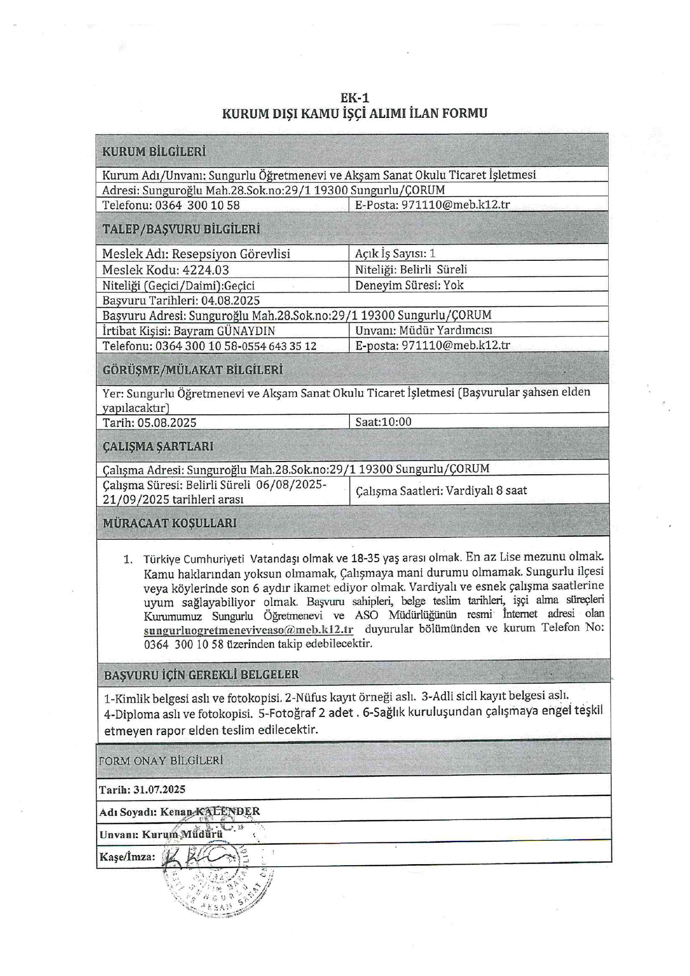 Çorum Sungurlu Belediyesi Geçici 1 İşçi Alacak