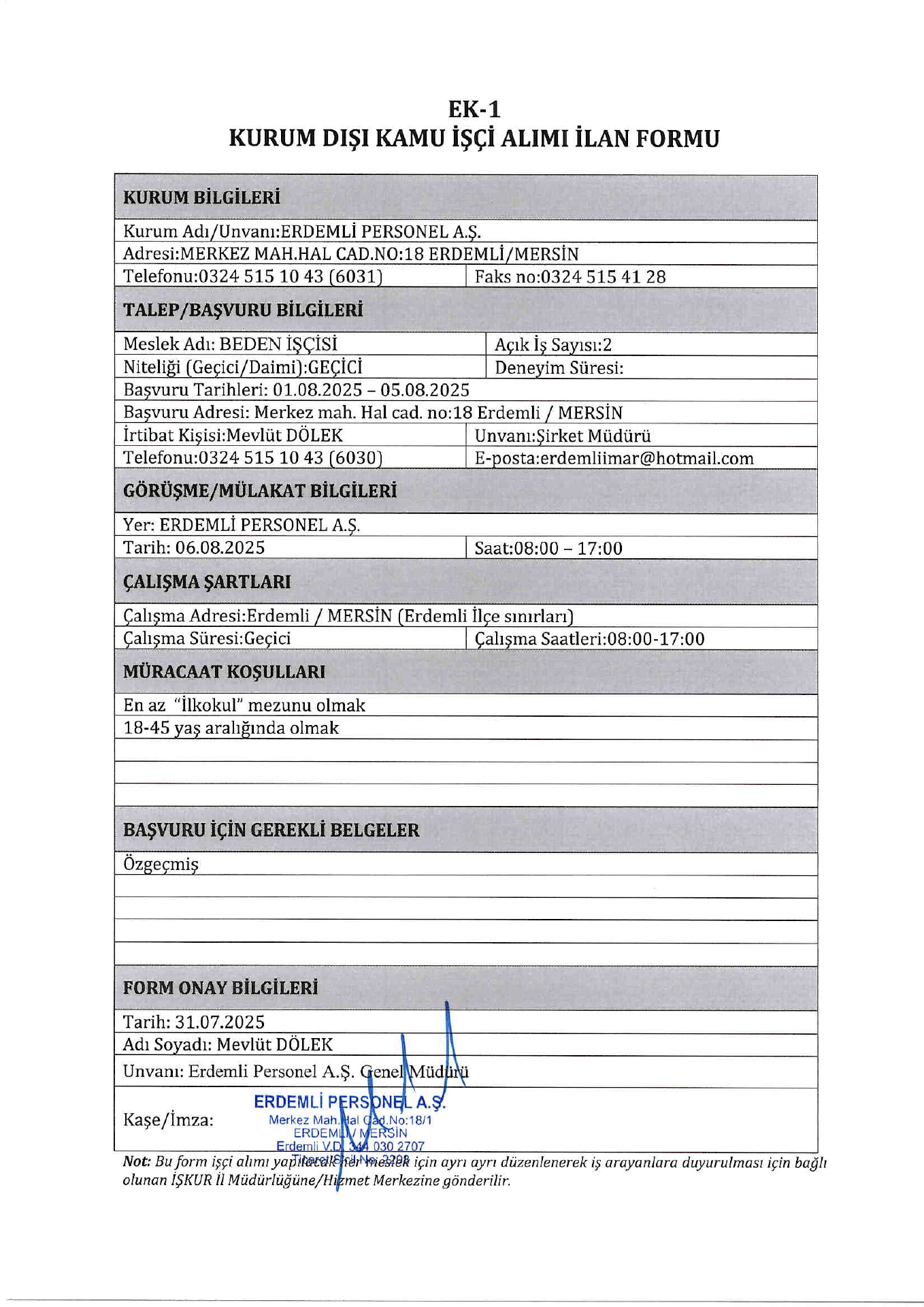 Mersin Erdemli Personel AŞ. Geçici 1 İşçi Alacak. Son başvuru tarihi 05 ağustos 2025